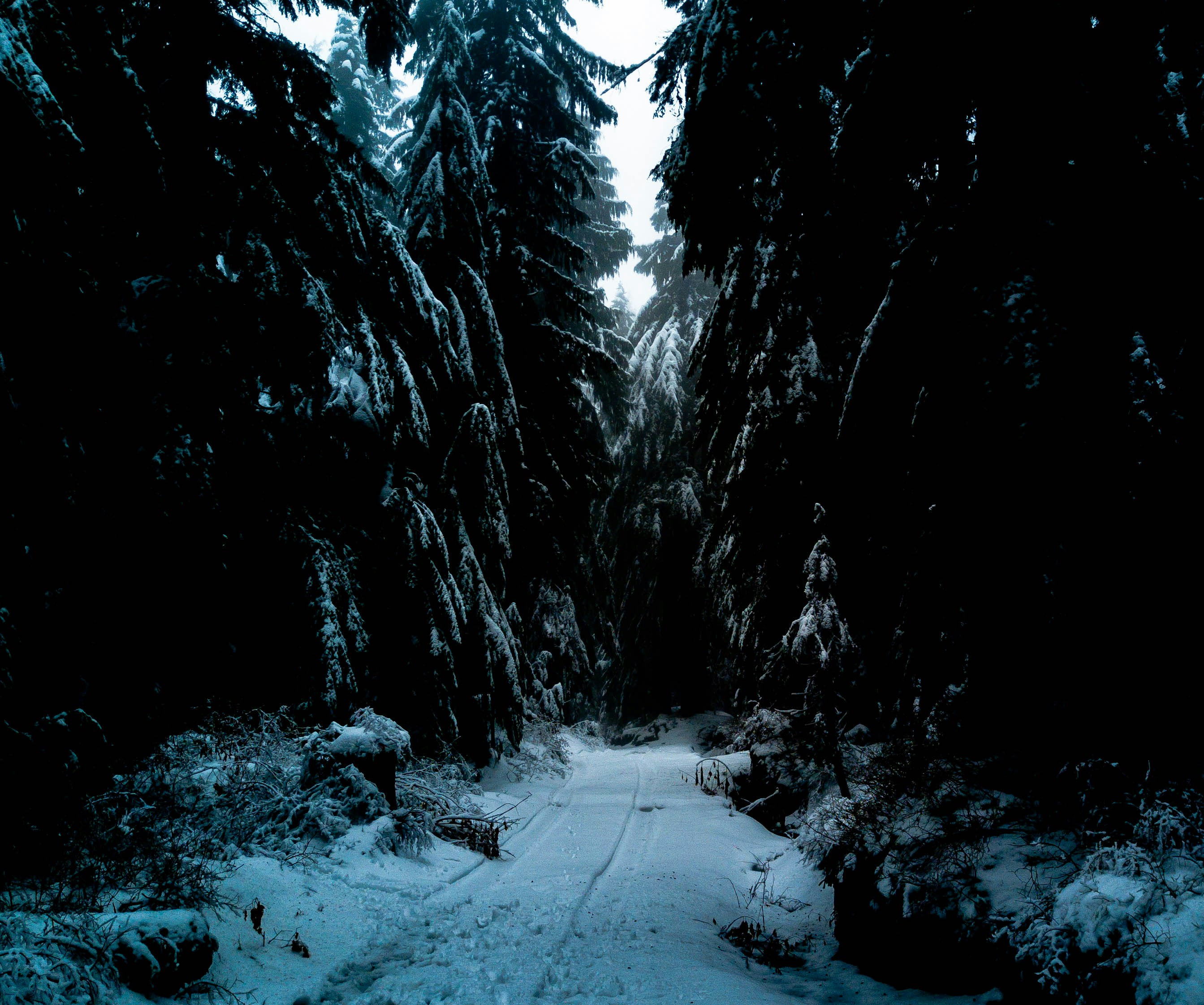 轨道,道路,道路,雪,冬天,树木,林地,森林,黑暗,霜冻,小径,阴郁,心情,三通