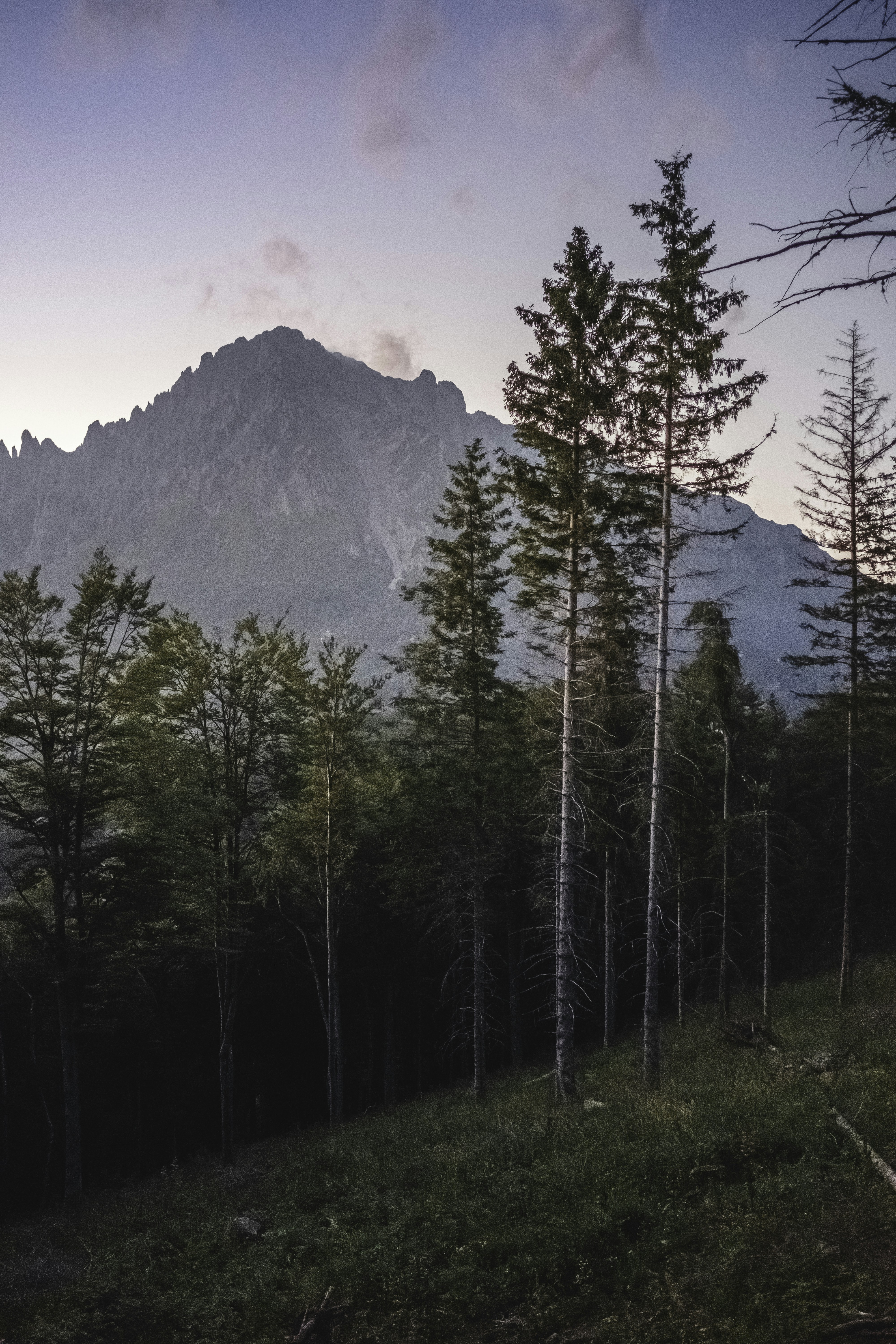 黄昏,杉木,松树,森林,环境,复制空间,没有人,徒步旅行者,山,自然