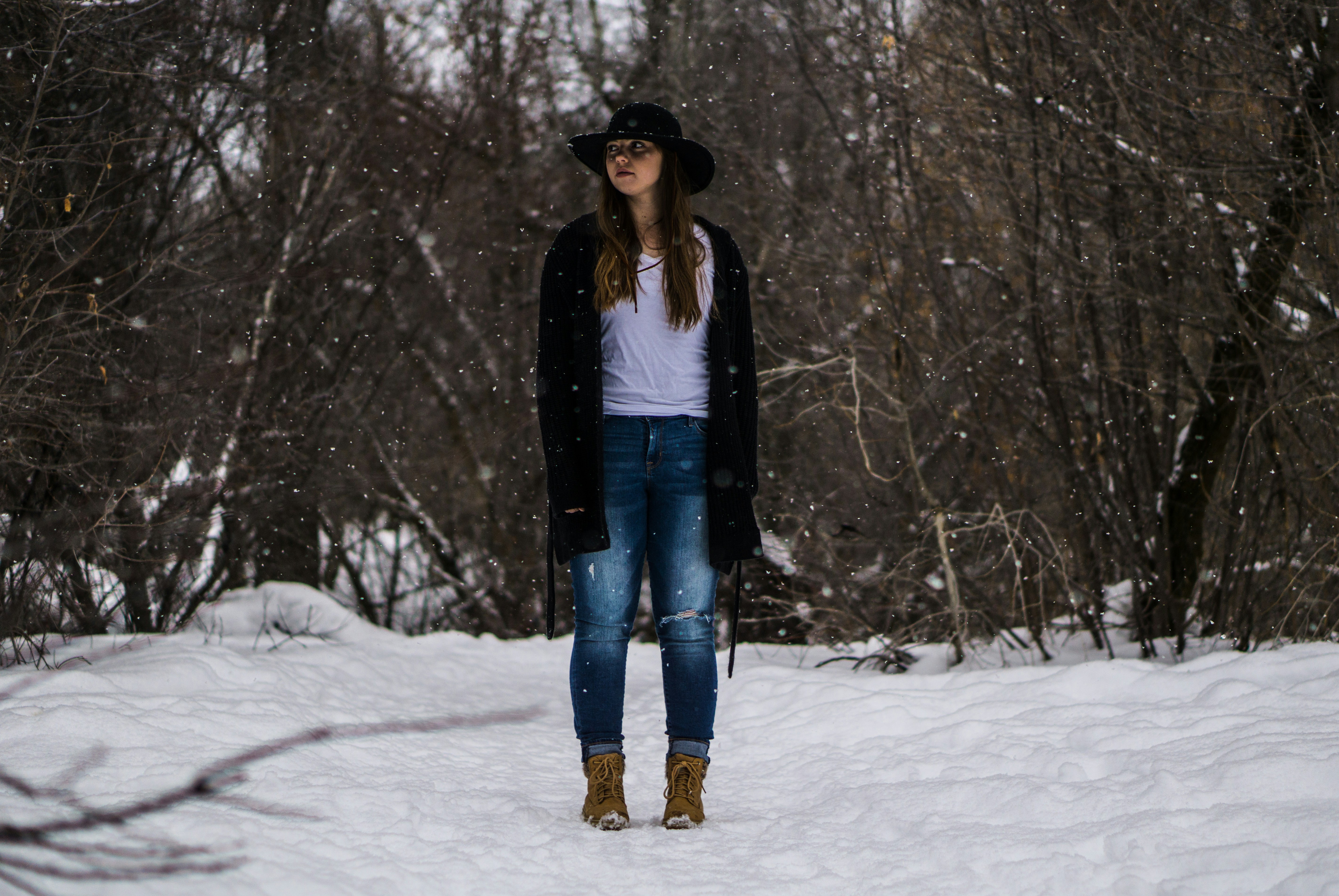 a blacktop road in a forest during snowfall; yellow traffic lines are painted crisply in the center