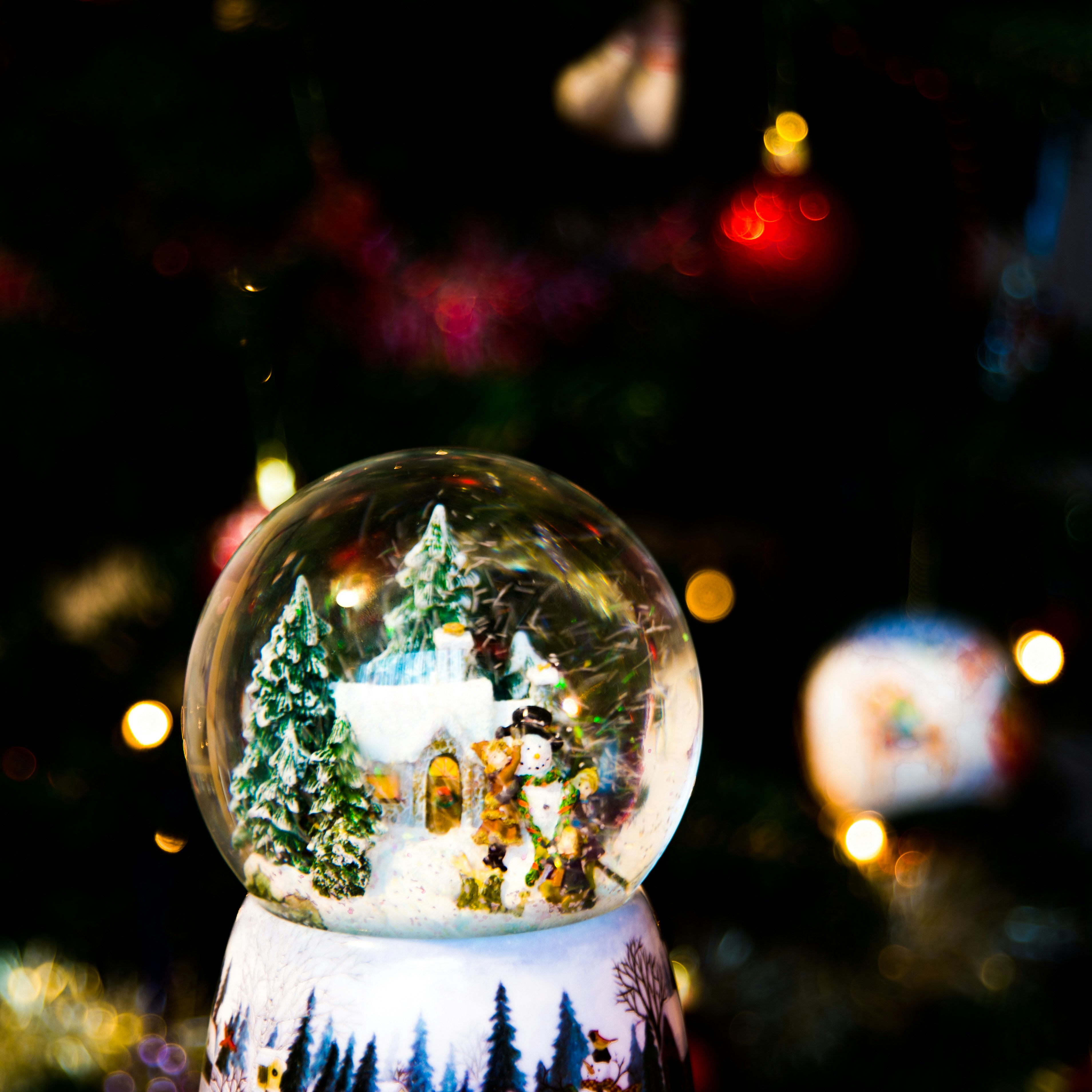 a snow globe with a winter scene displays a house surrounded by a couple evergreen trees and a snowman. a decorated christmas tree is barely visible behind the snowglobe.