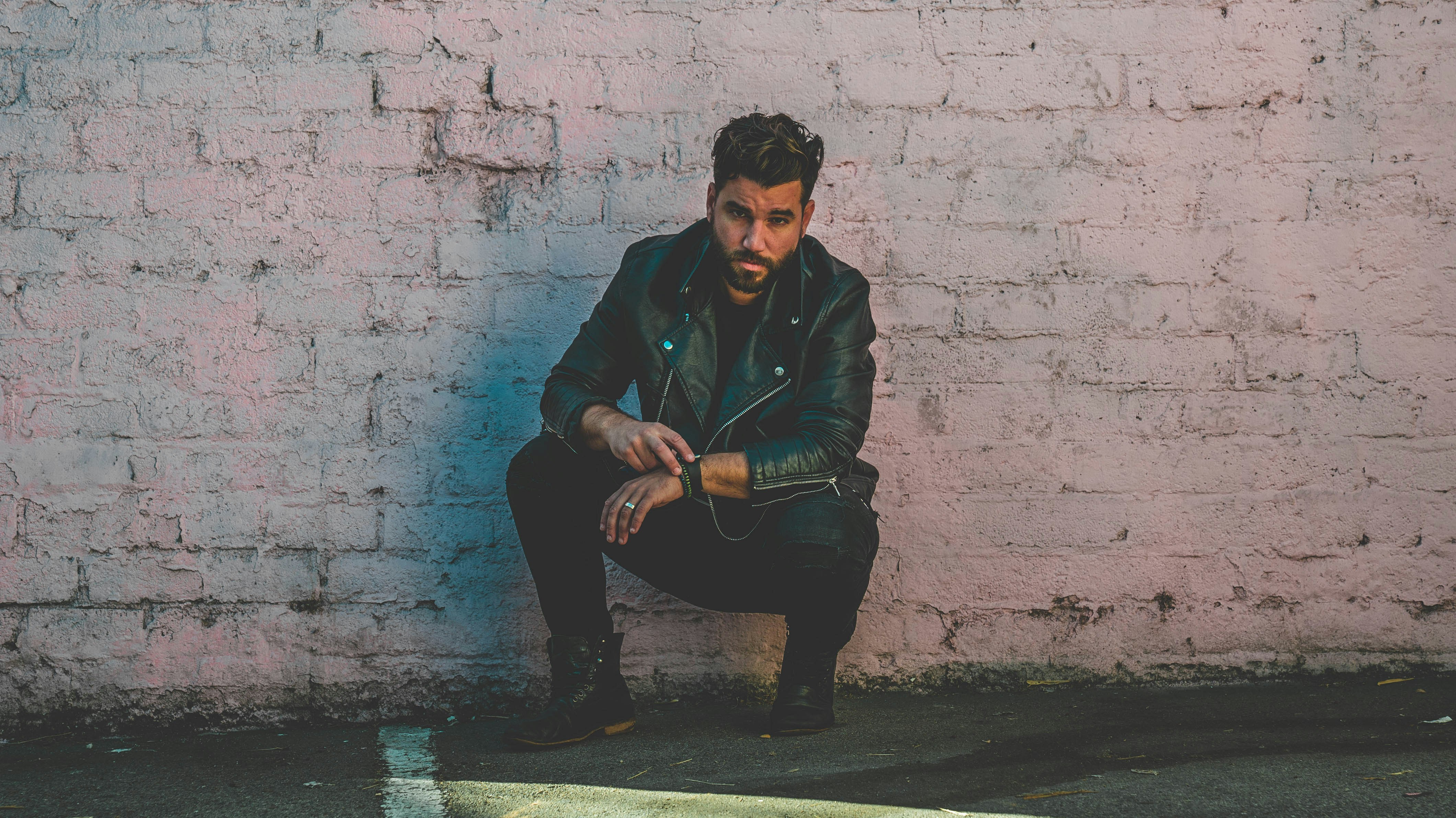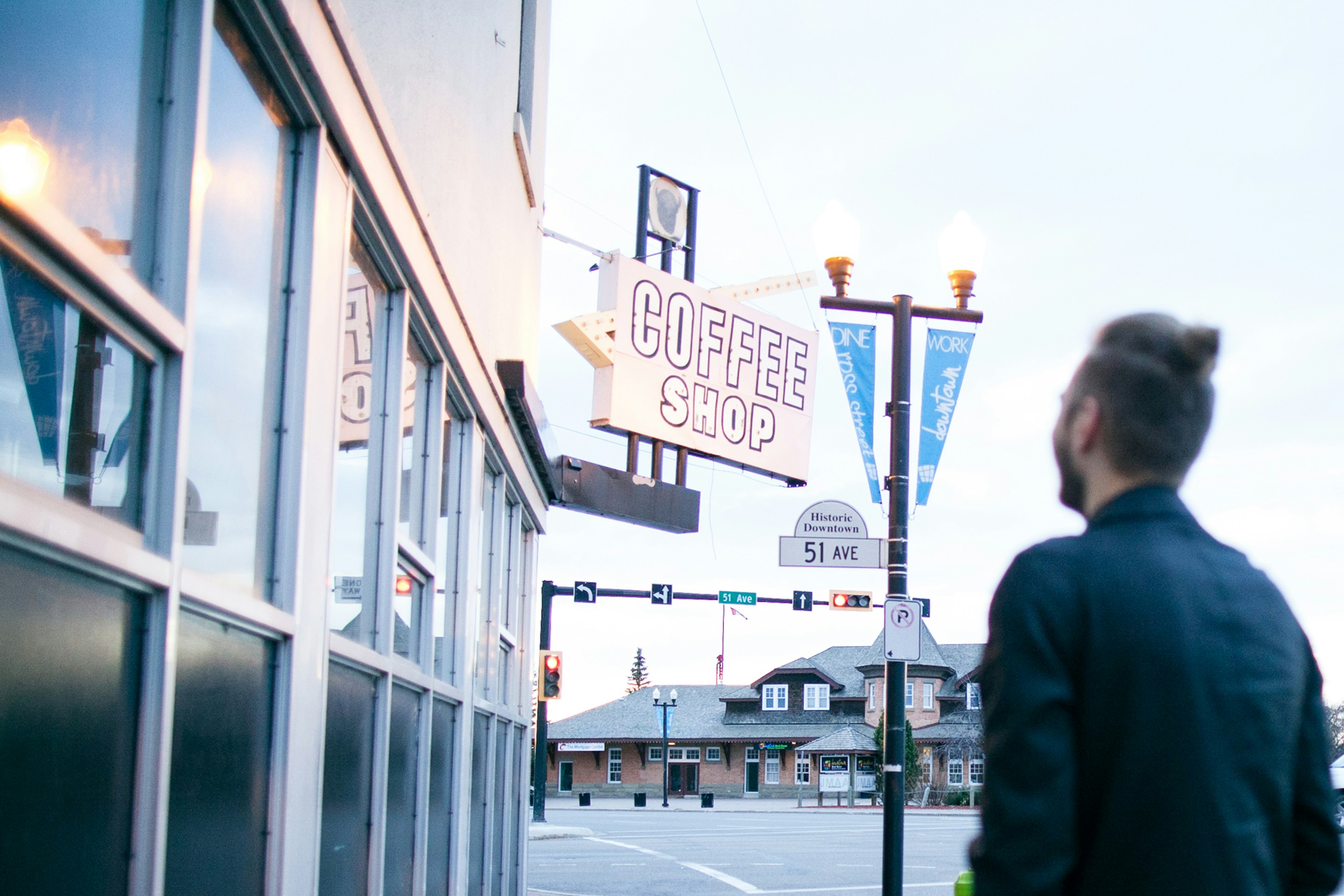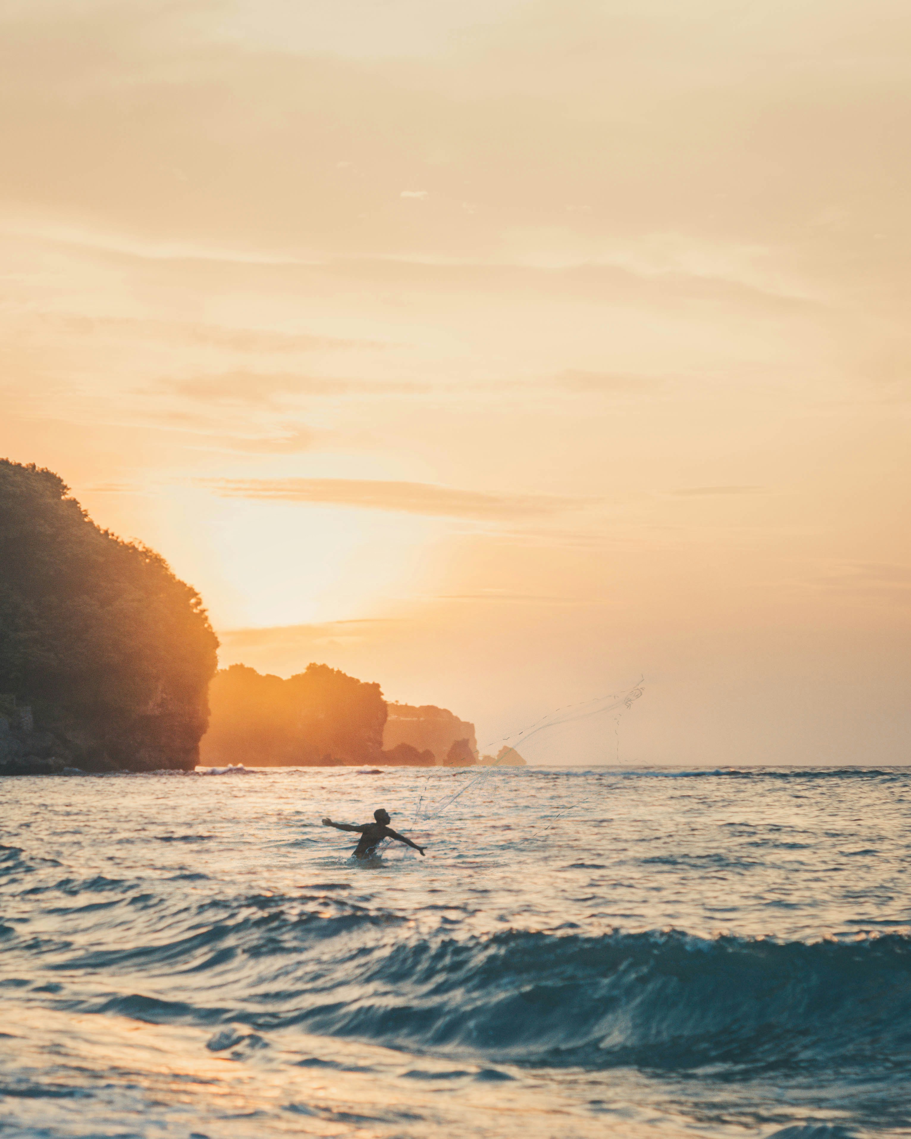 A man walks on Newport Beach with a low sunset casting the lifeguard hut into silhouette.