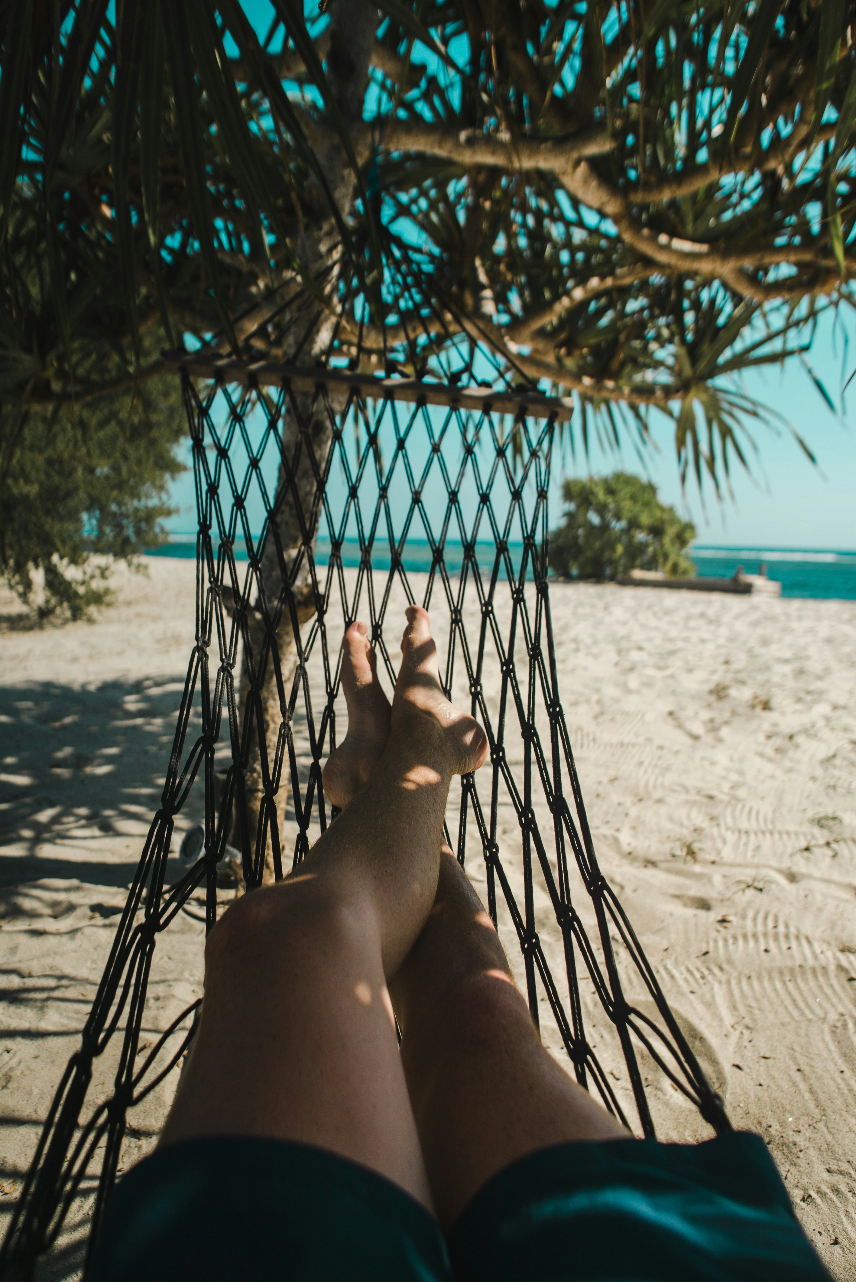 hammock,string,hanging,tree,beach,sand,water,sea,ocean,shadow,summer,legs,shorts,blue,sky,fullframe,a7sii,sony,hengekøye,chillout