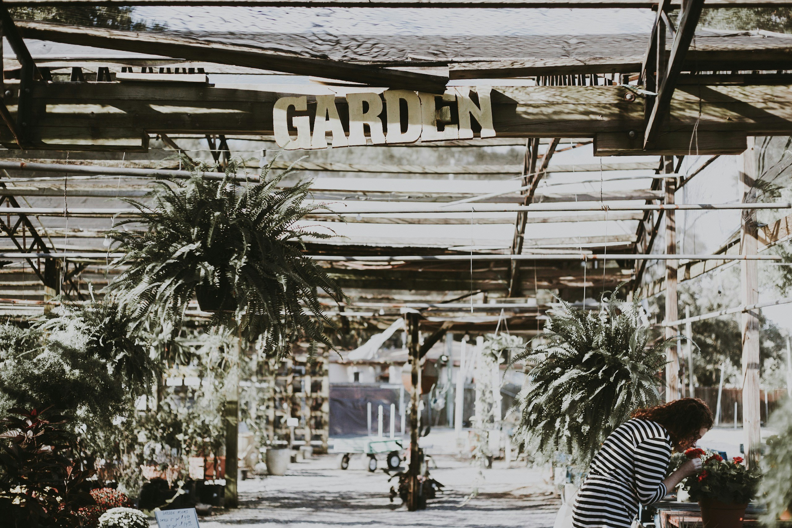 花园、商店、条纹、女人、女人、花卉、植物、温室、小车