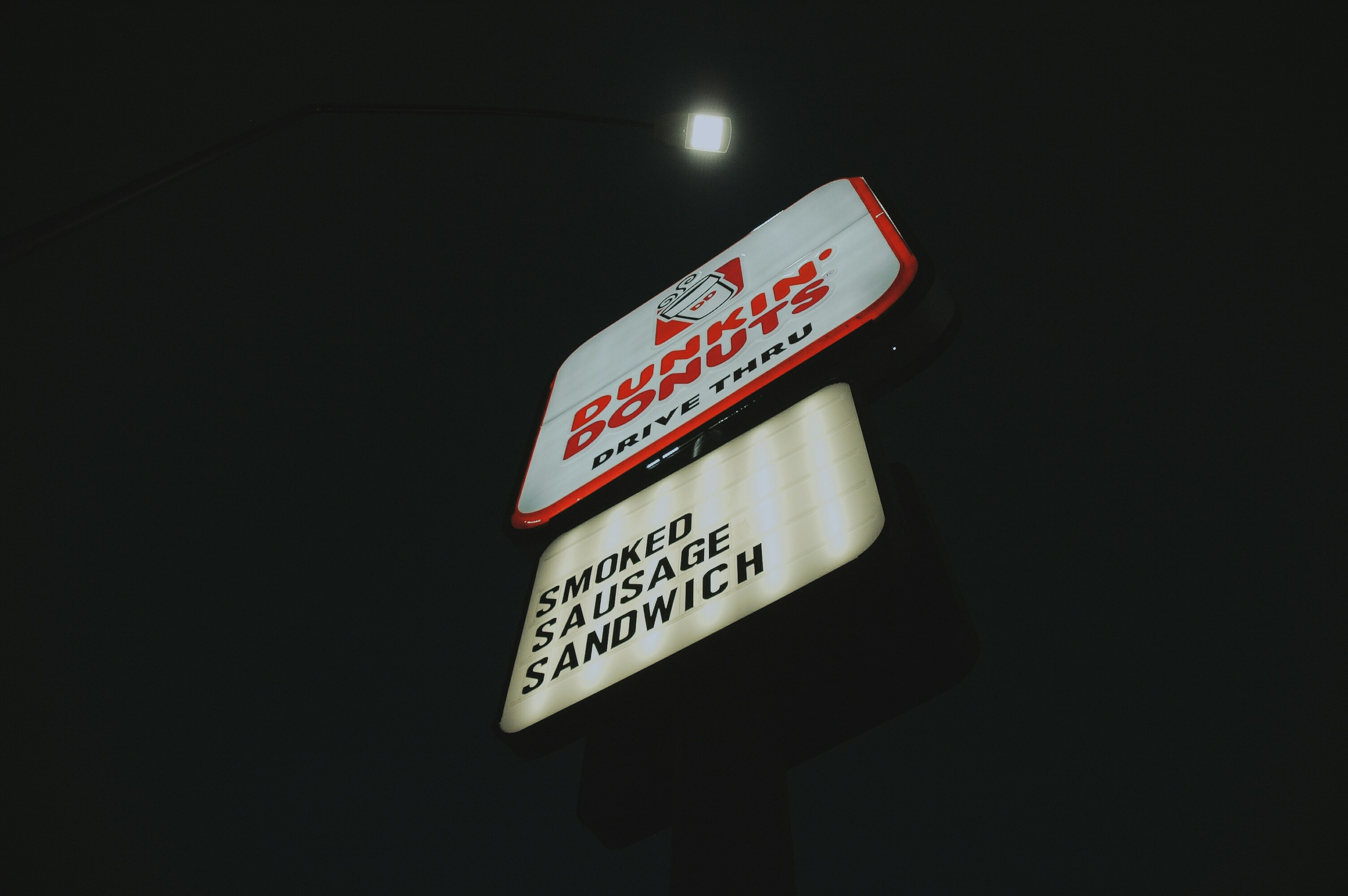 食物、驾驶、甜甜圈、标志、路标、霓虹灯、夜景、标志、公共场所