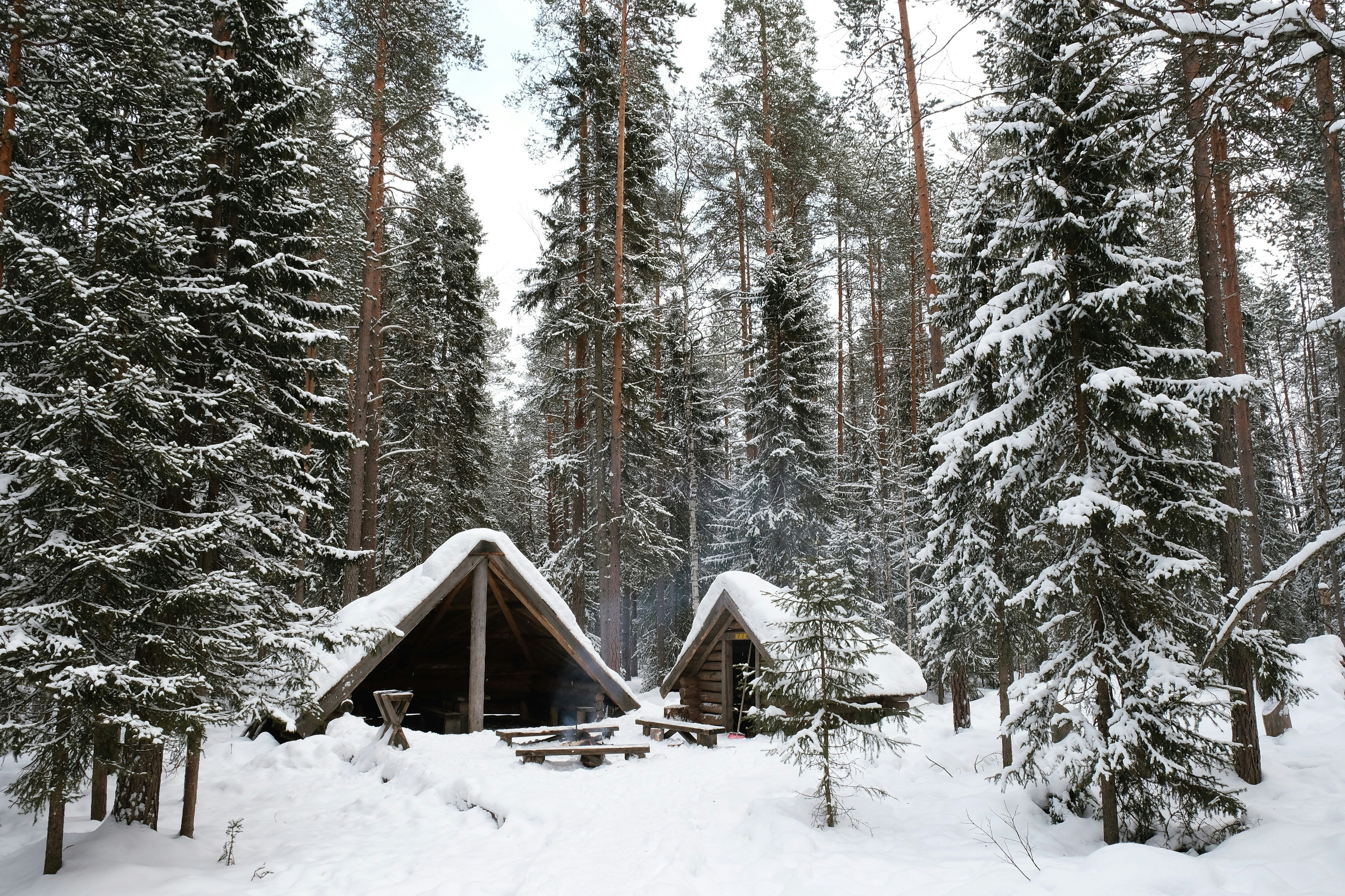 在芬兰寒冷的冬季里,罗瓦涅米森林里的小木屋