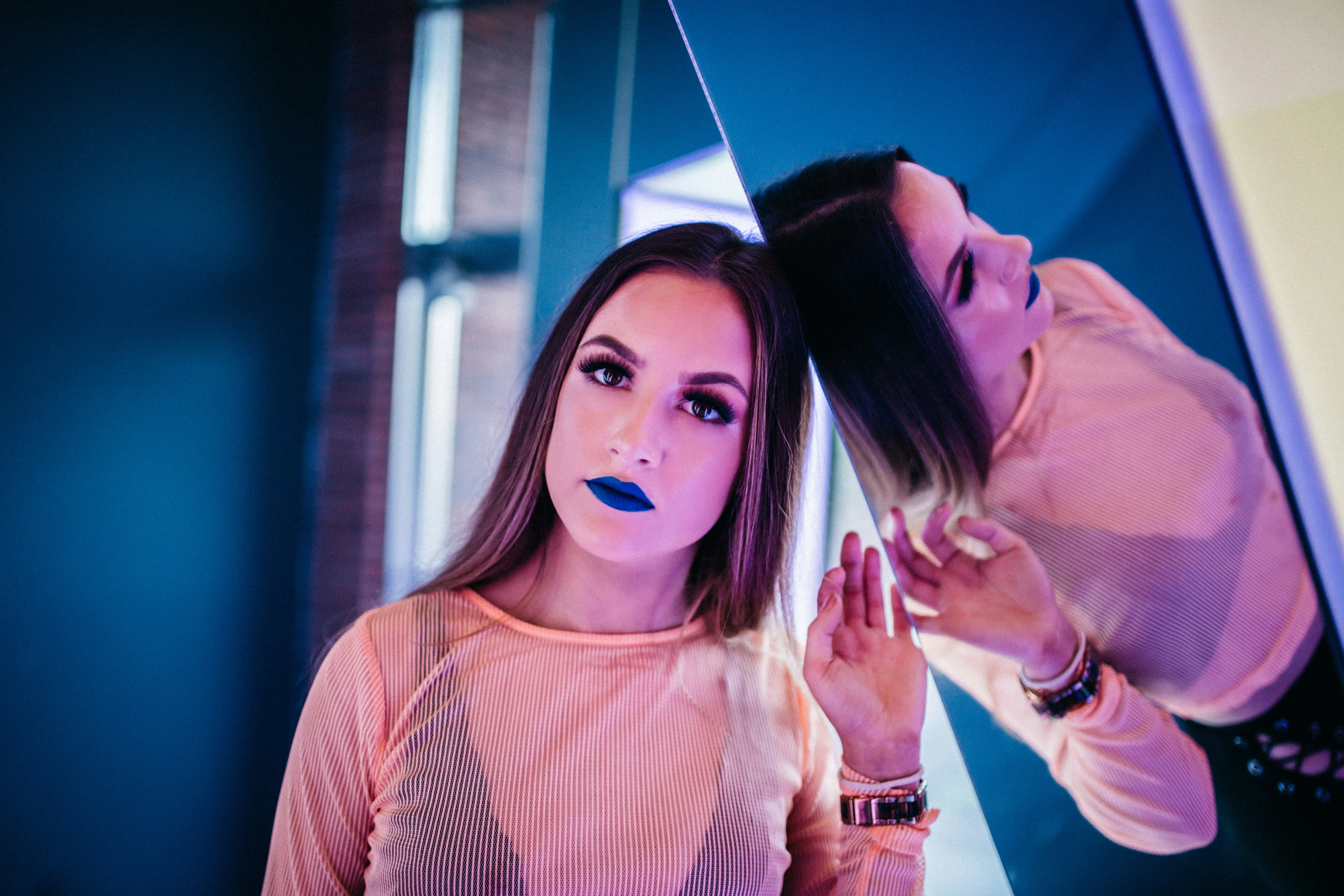 女人,女人,嘴唇,蓝色,镜子,反射,蓝色唇膏,化妆,镜子反射,镜像,铺设,肖像,霓虹灯,模型,唇膏,Refjjo,Bellz,ChICA,ReTrto
