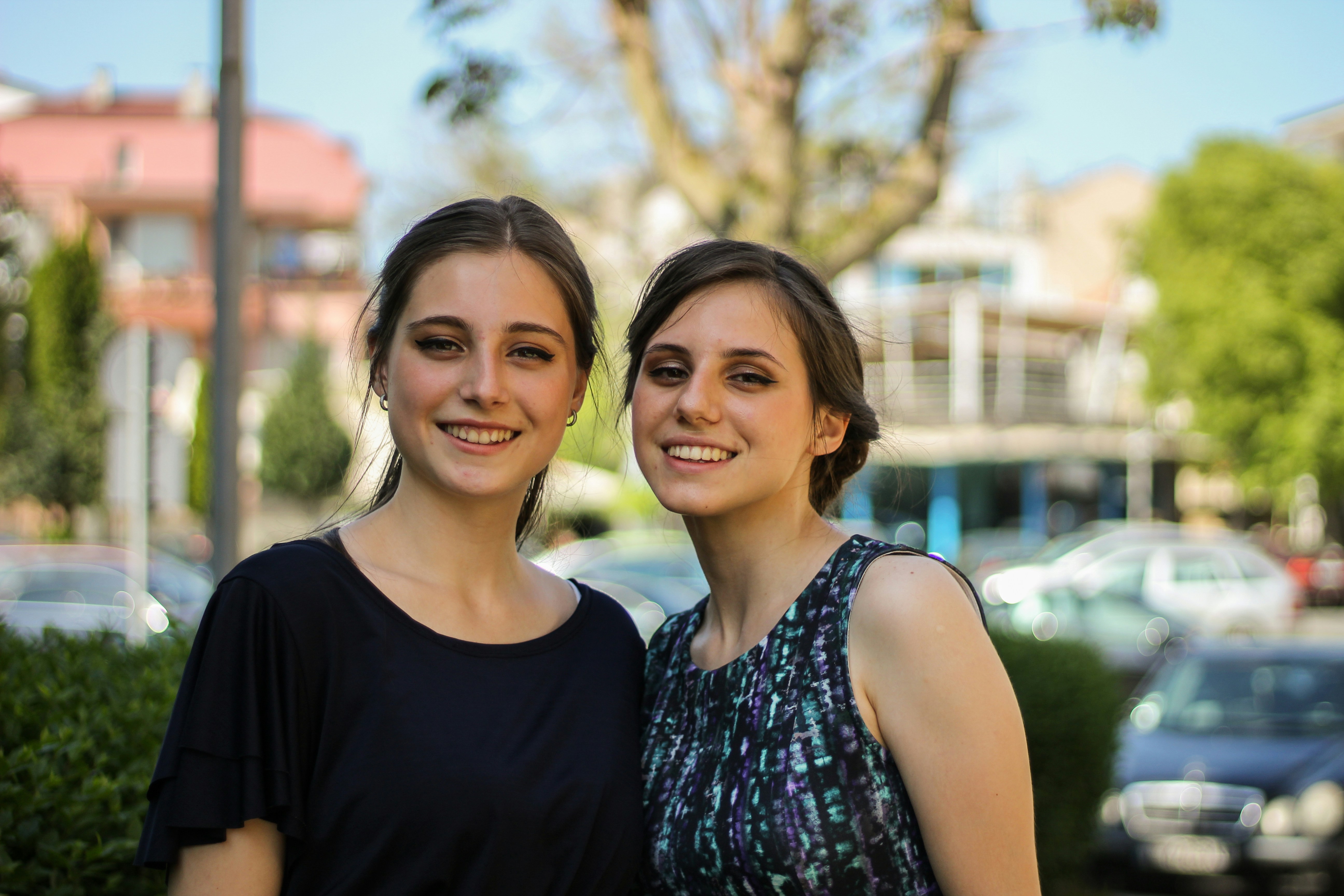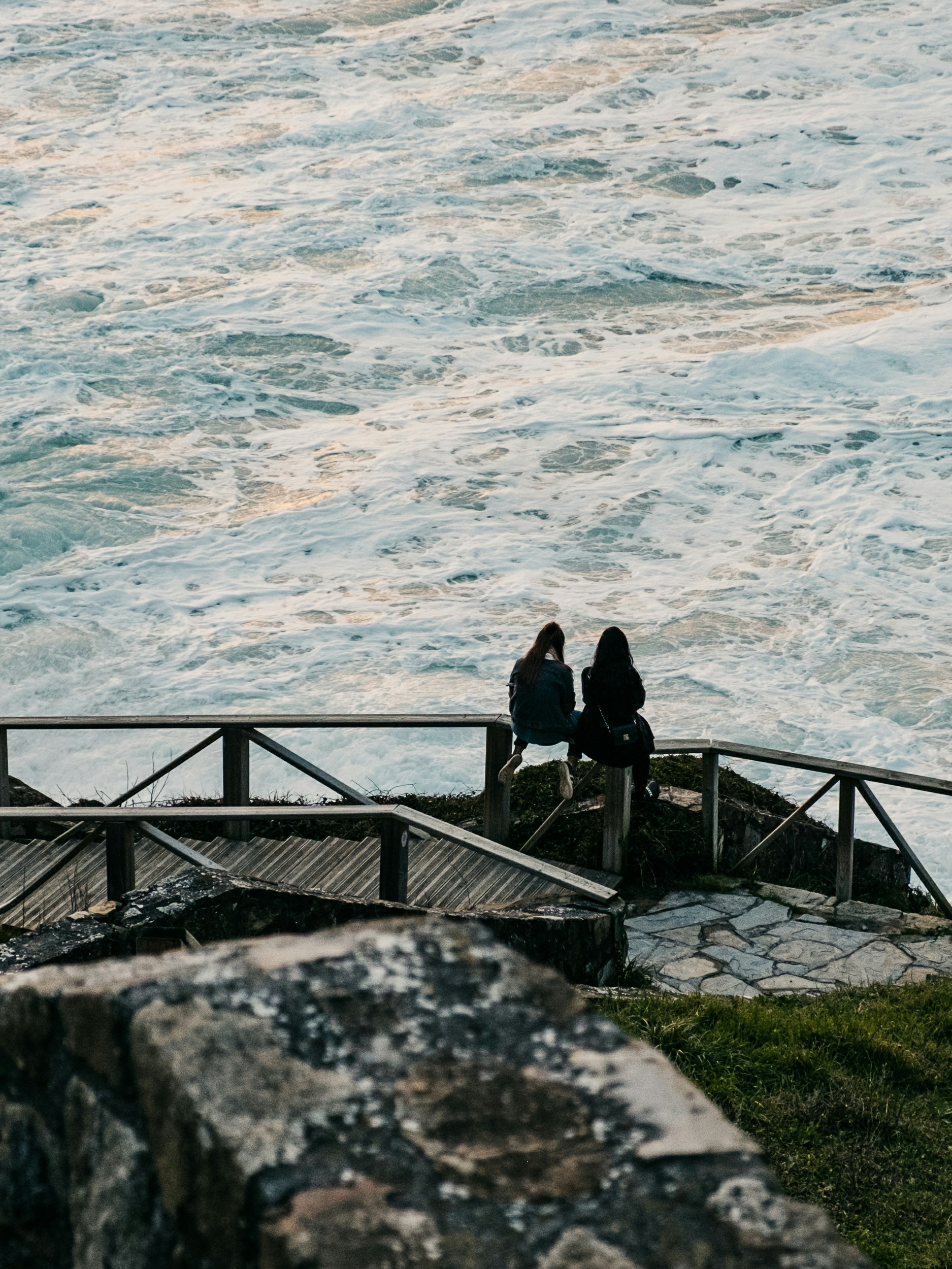 The back view of two women sitting in the cockpit of a helicopter wearing headsets.