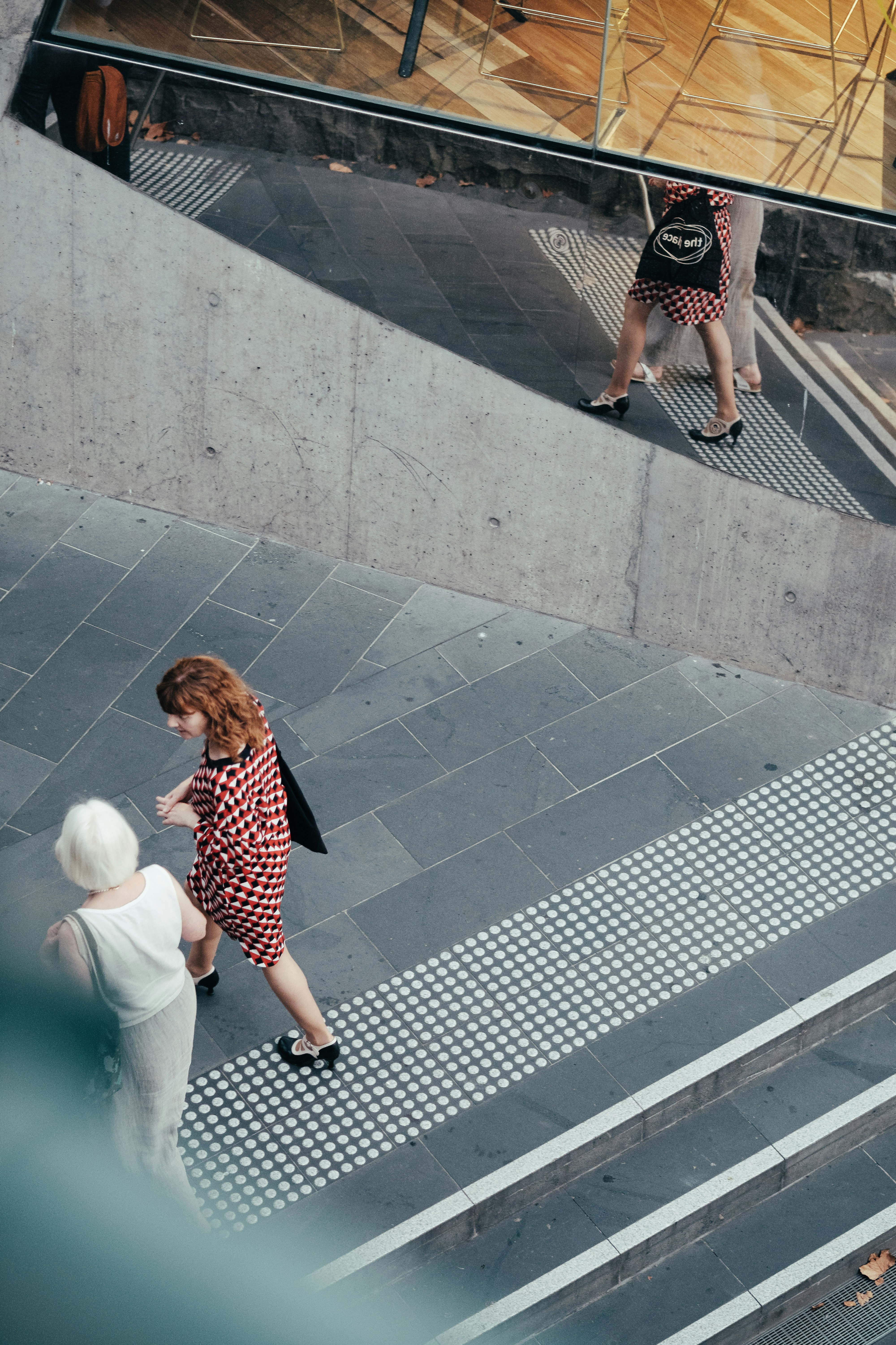 女人,镜子,城市景观,楼梯,人行道,街道,人,夫妻,建筑,城市,城市,步行,窗户,包,腿,上面,倒影,墨尔本,56毫米,街头摄影