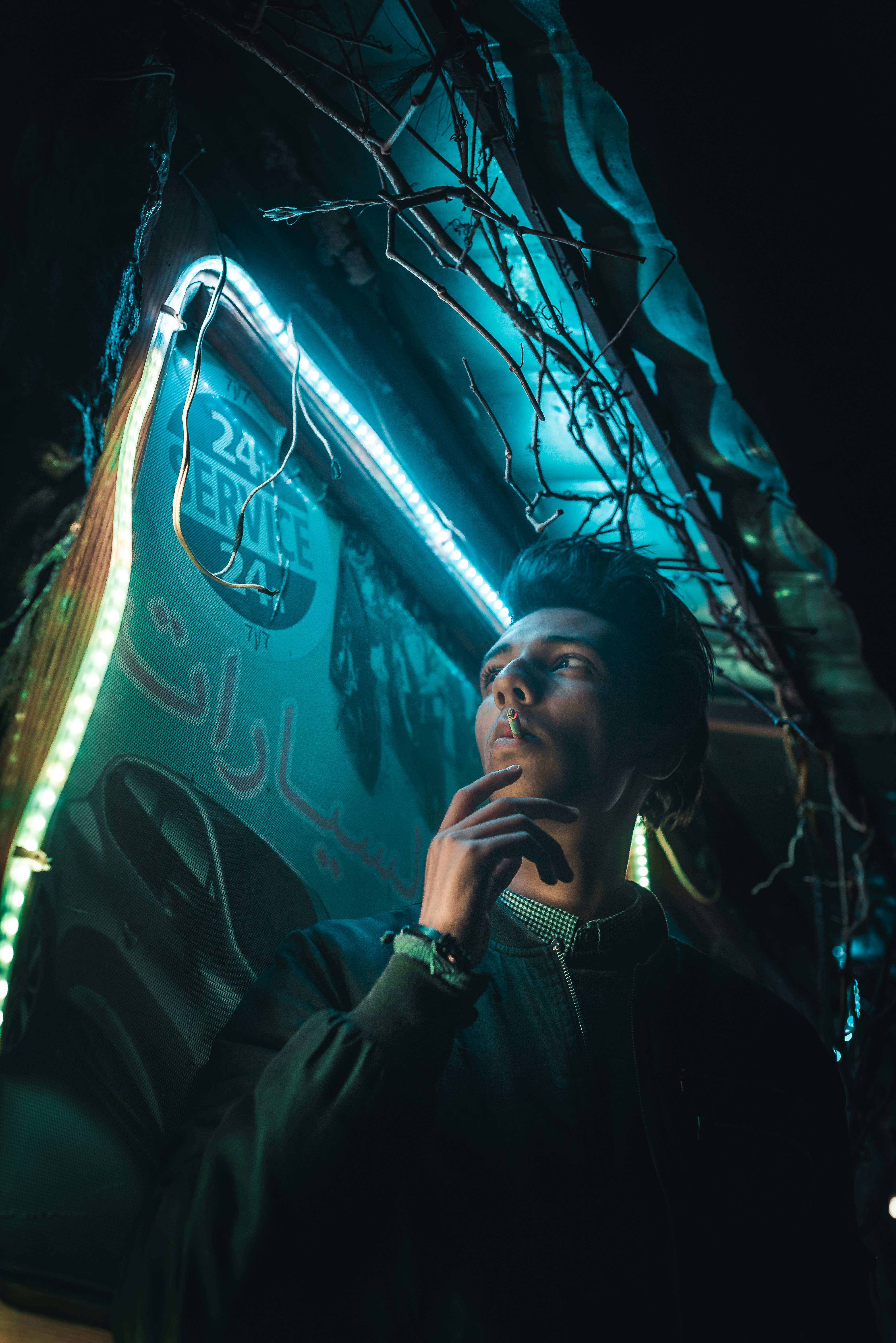 肖像,男人,香烟,烟雾,吸烟,人,脸,霓虹灯,霓虹灯,城市,街道,停车场,灯光