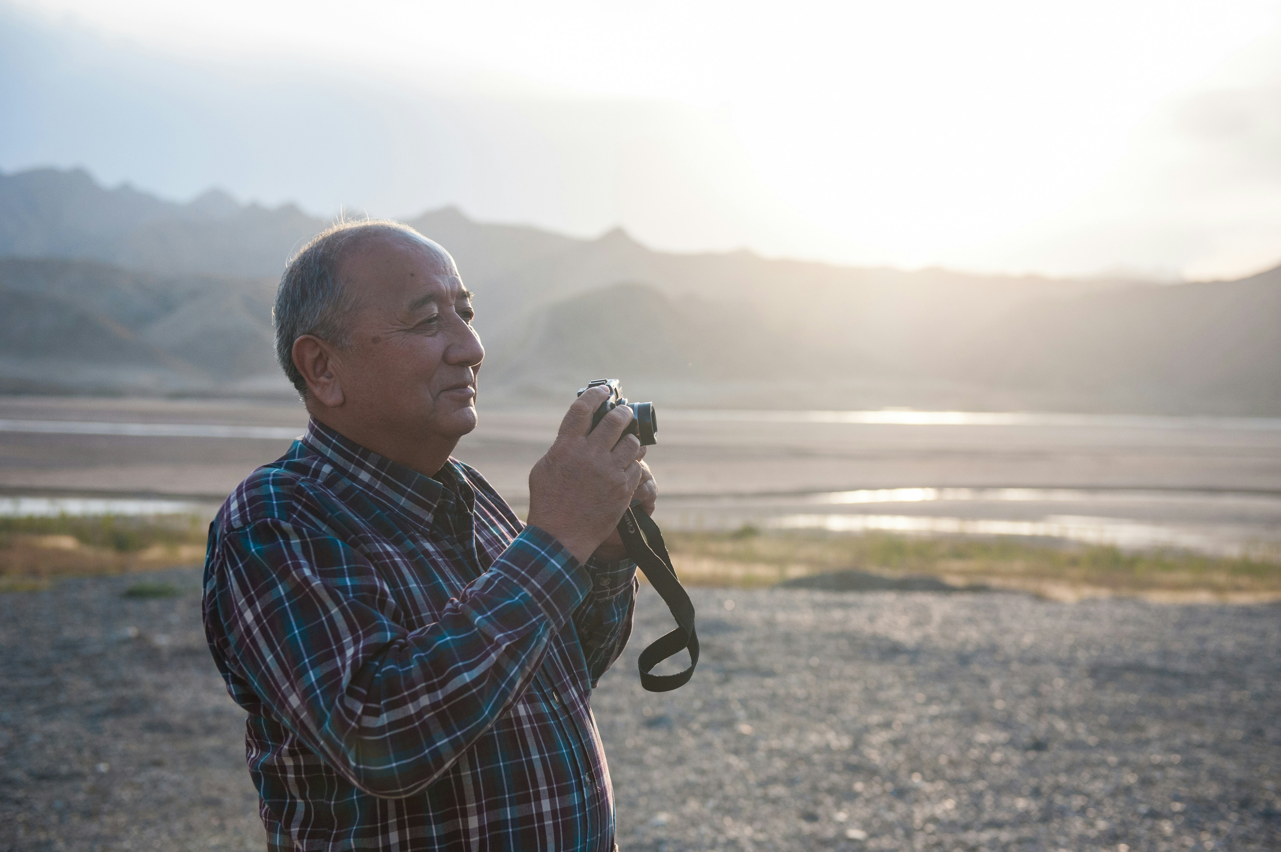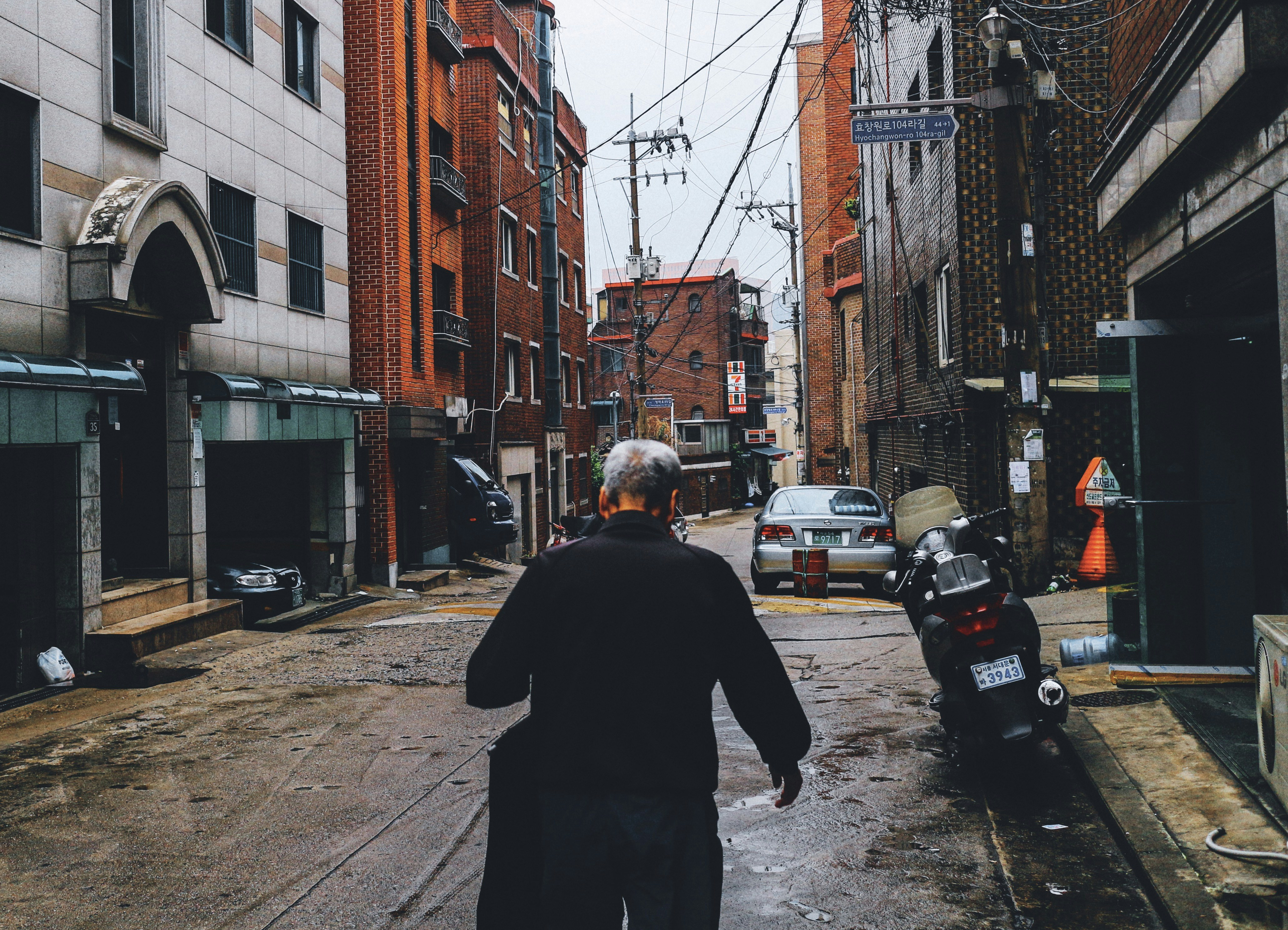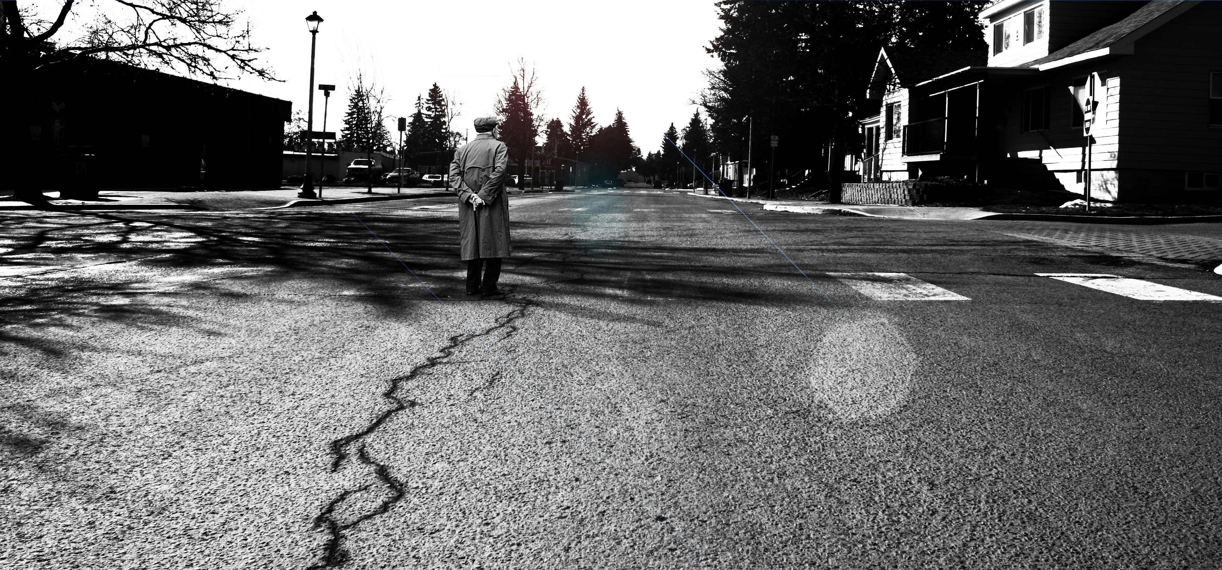 an elderly man walks in the middle of an old cracked street road with lamps and houses.