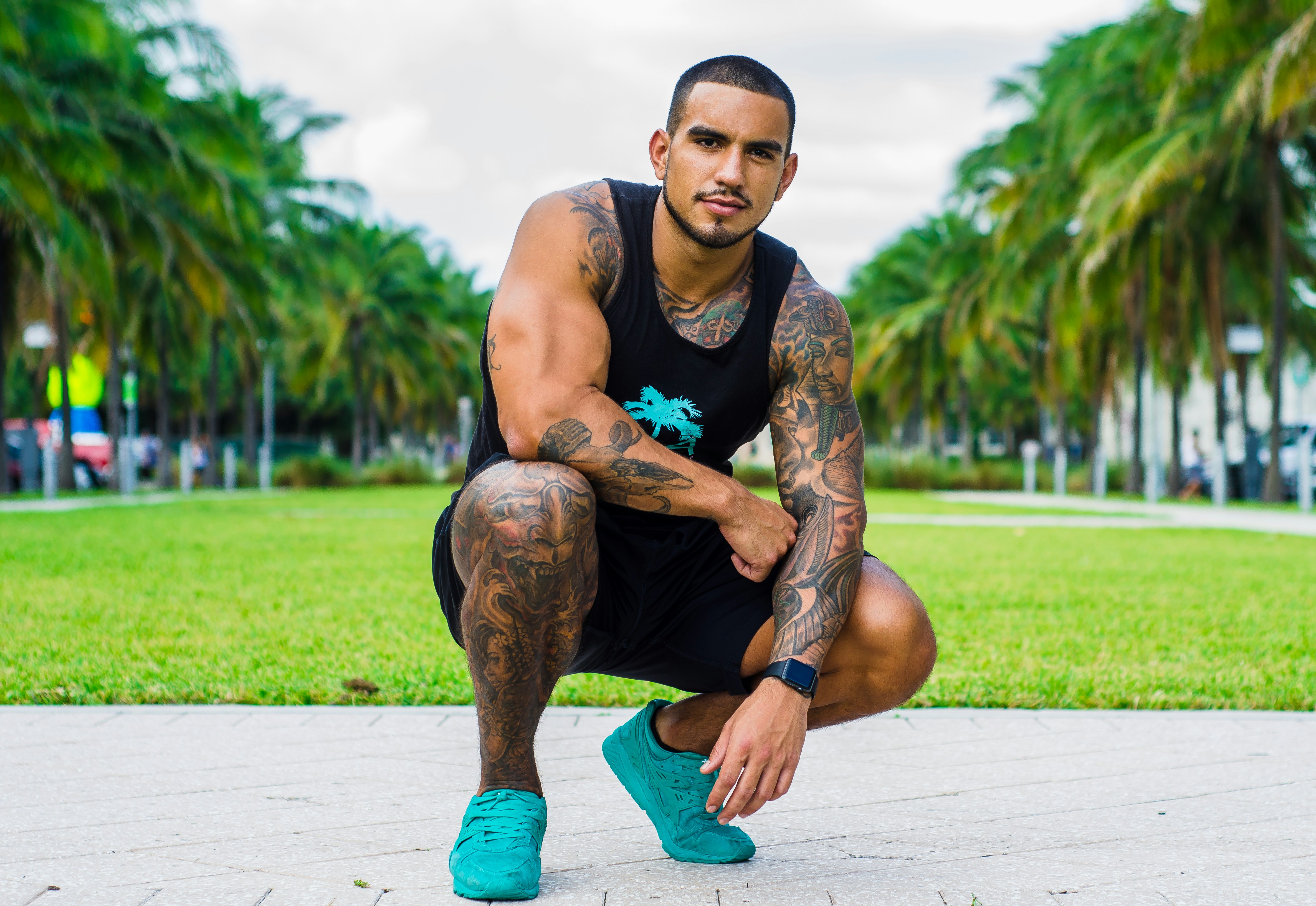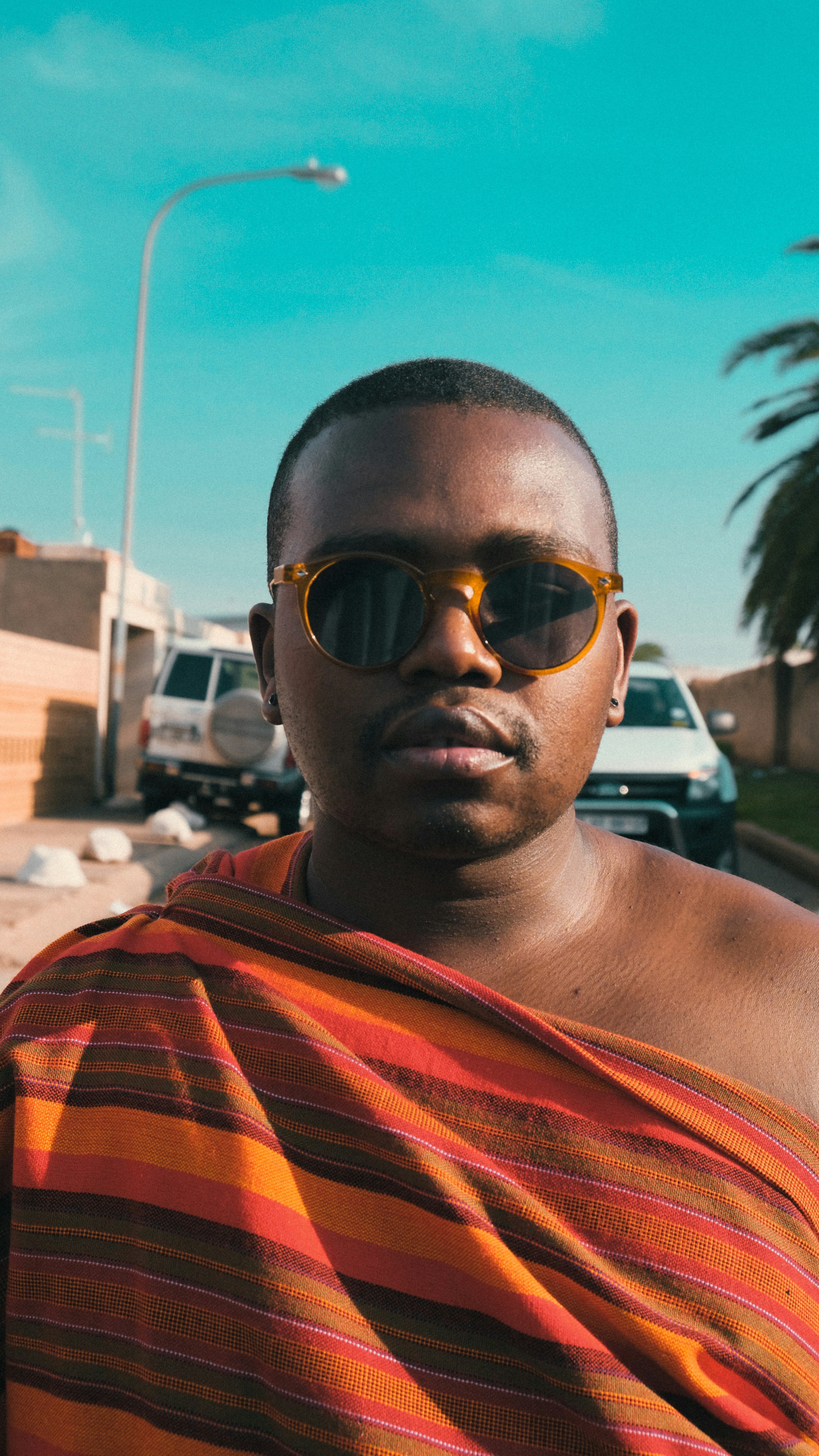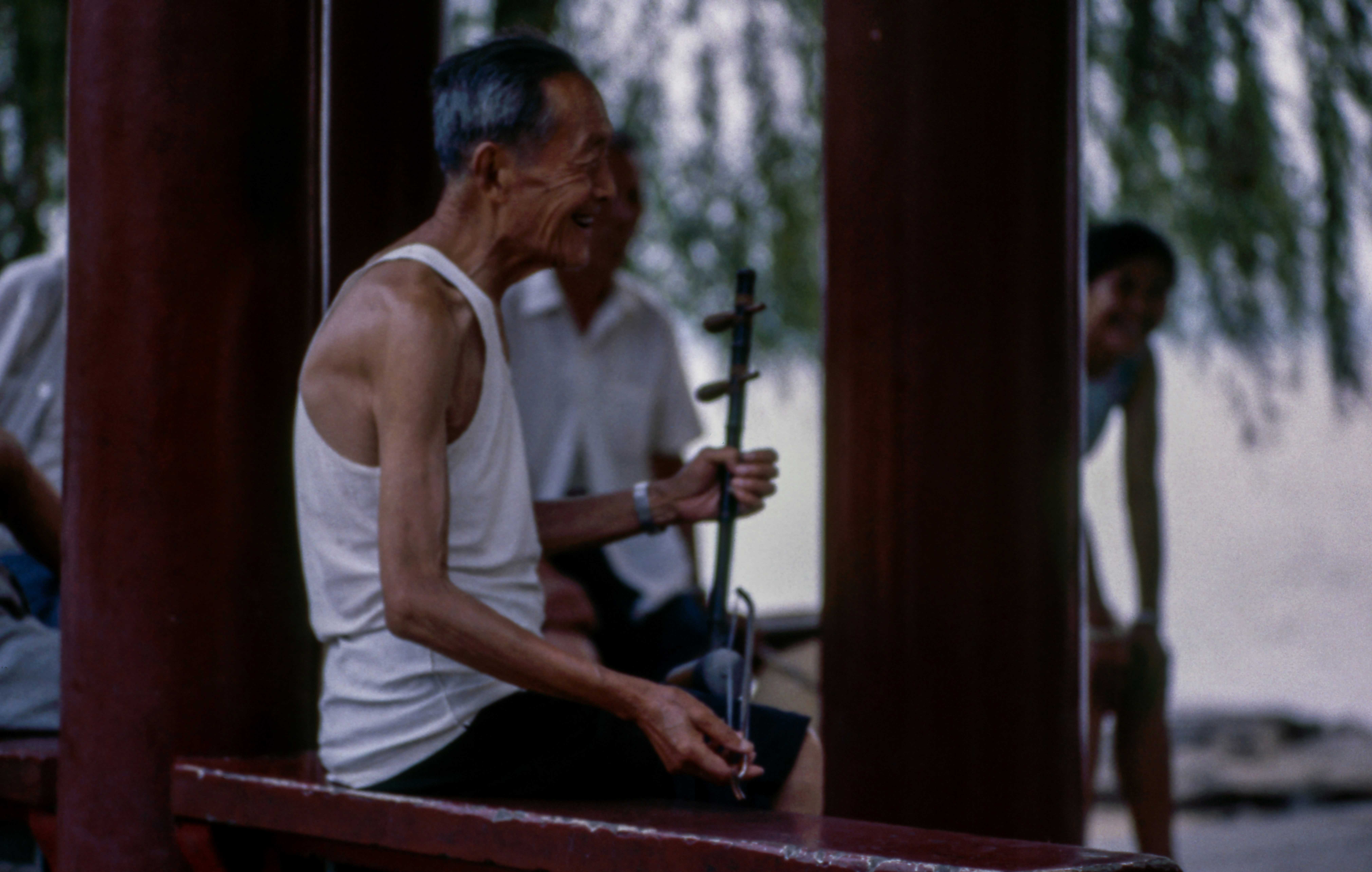 an elderly man walks in the middle of an old cracked street road with lamps and houses.
