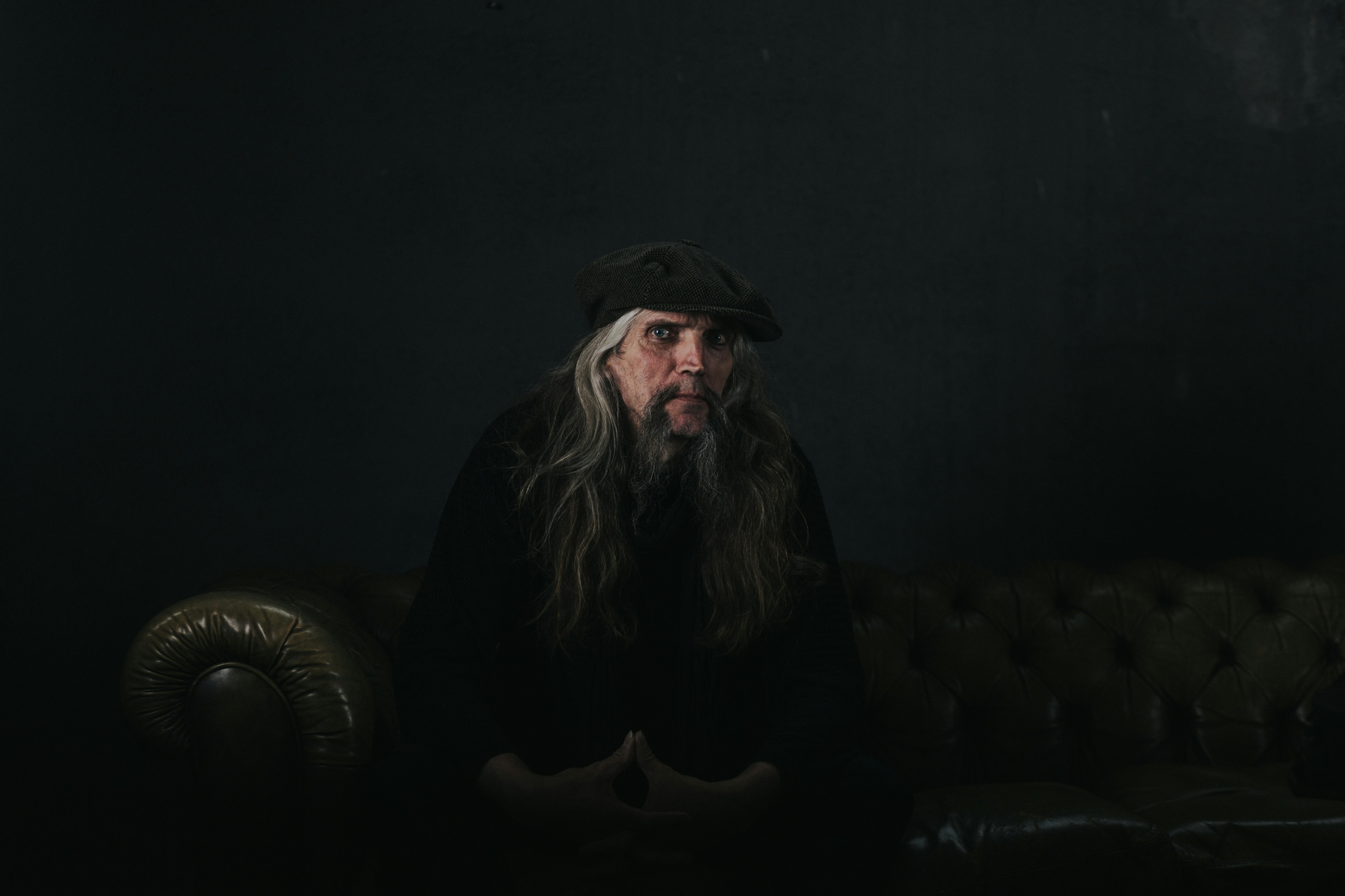 a portrait of a wrinkled elderly man smiling at the camera while holding a walking stick.