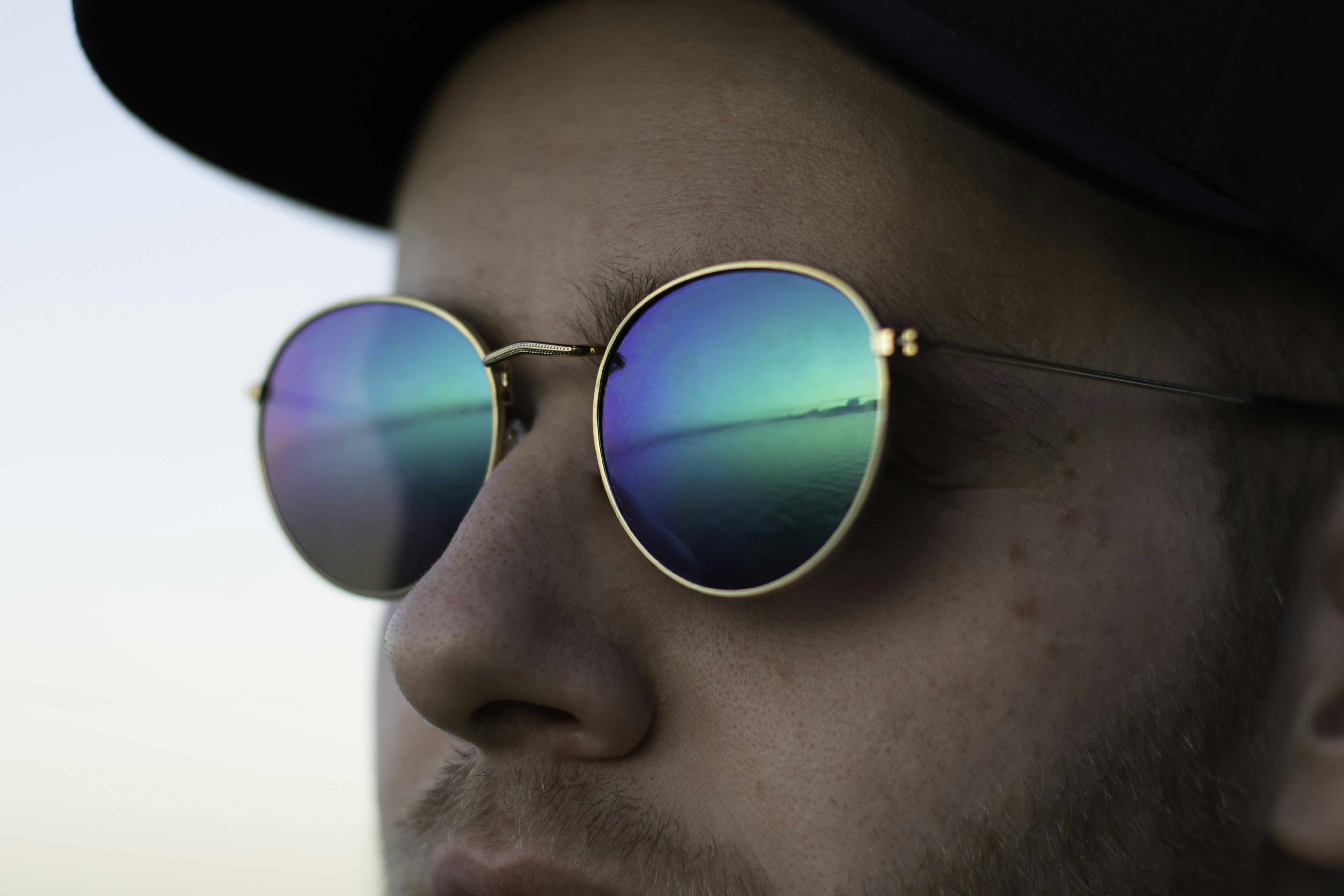 man standing in a field, against an orange and light blue sunrise with grey clouds.