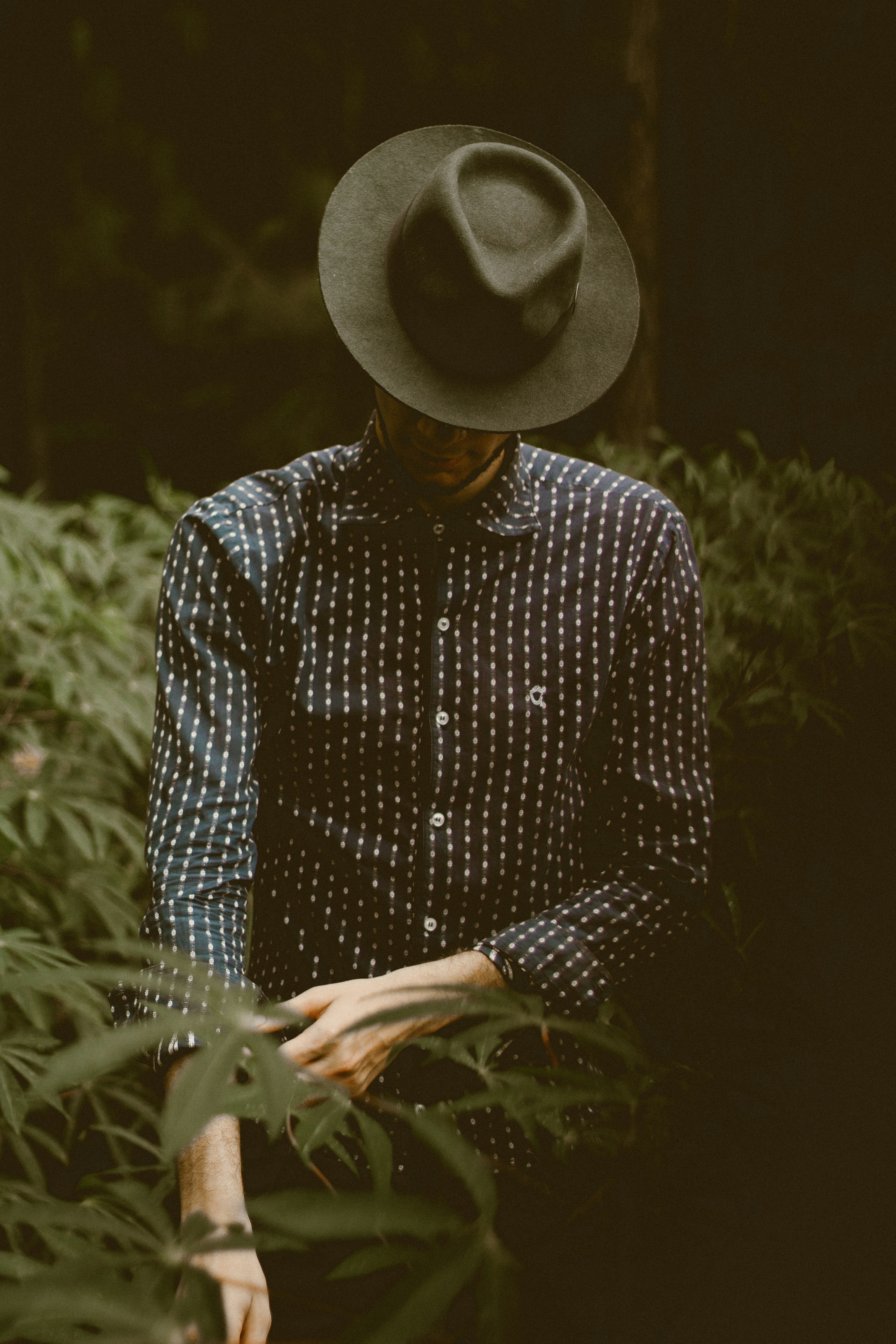 一个人站在灌木丛中戴帽子和圆点衬衫