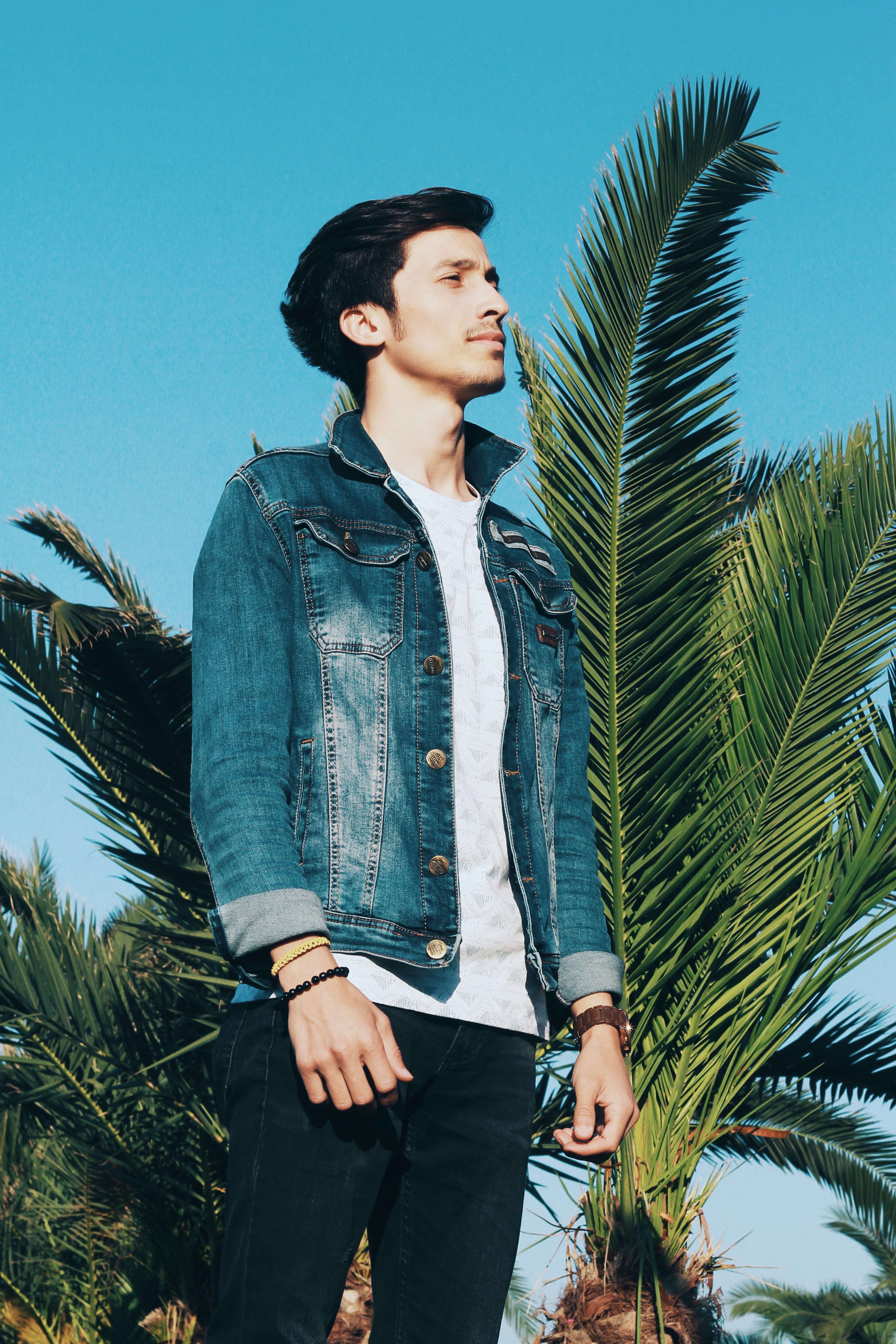 一个微笑的人穿着一件夹克在棕树和蓝天前