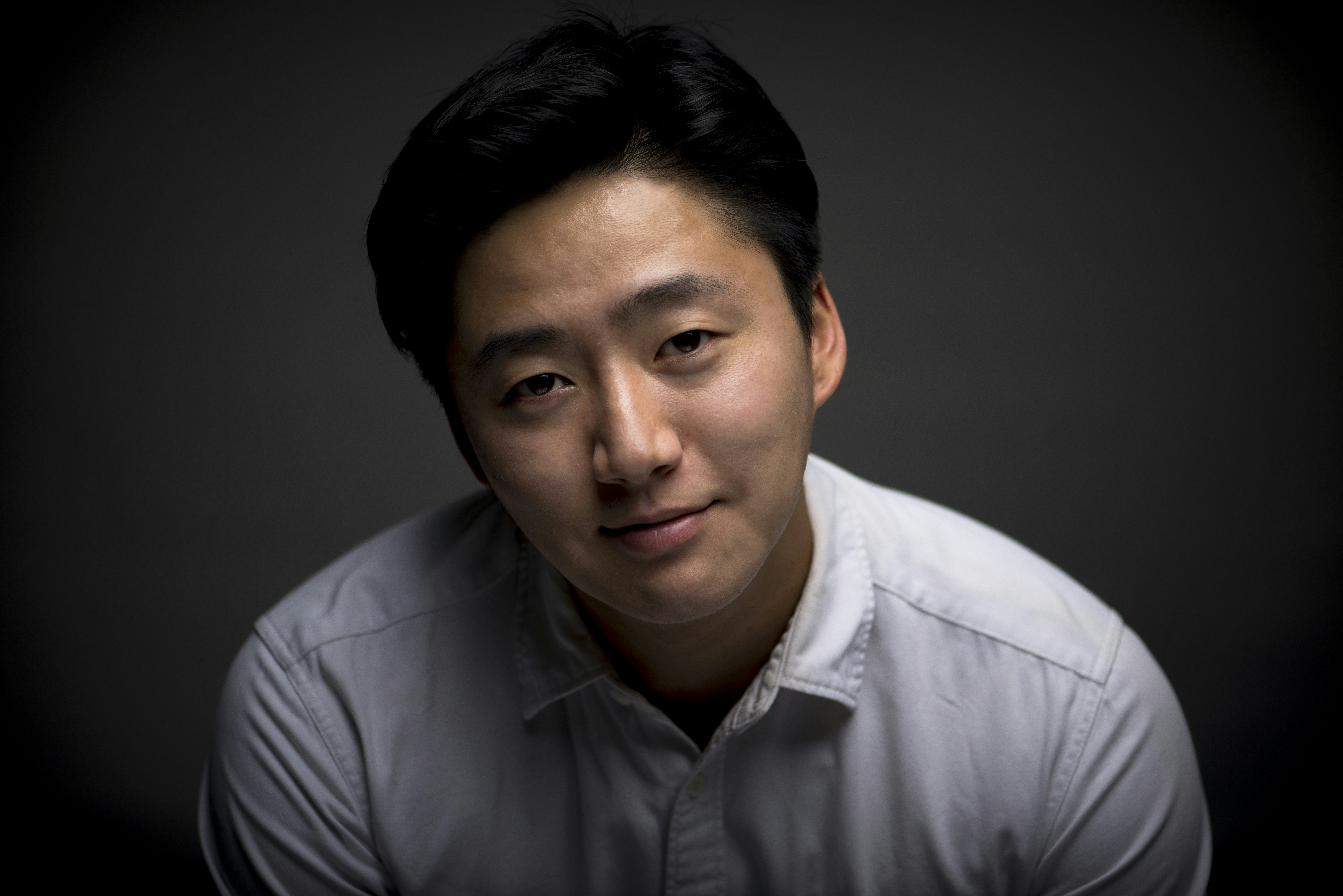 一个戴着帽衫的胡子男人直接对着黑色的照相机看。