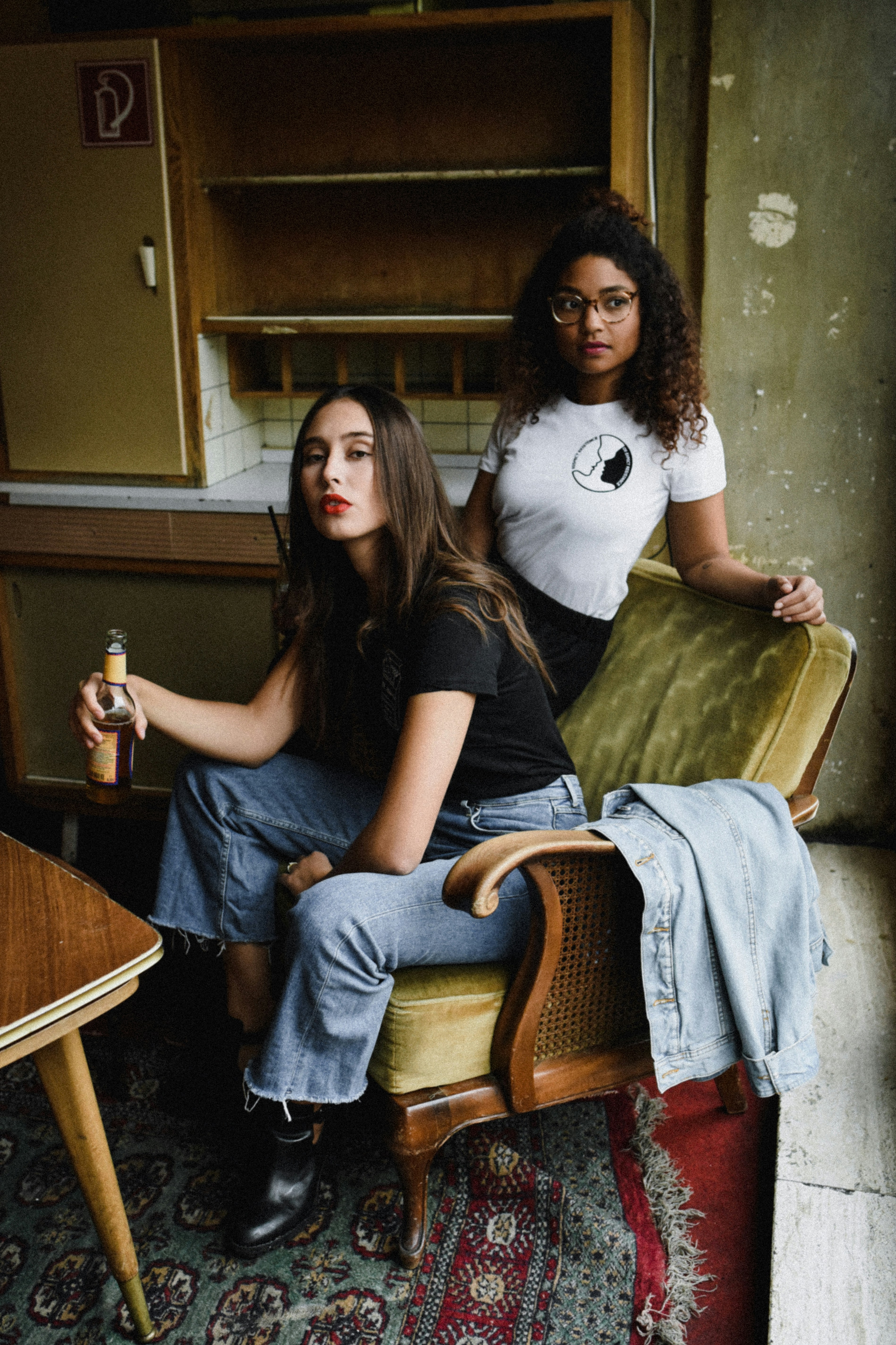 女、女、友、坐、椅、瓶、啤酒、白种人、非裔美国人、眼镜、七十、牛仔、模特、柏林、波希米亚、波希米亚、古董、时装、女孩、心情