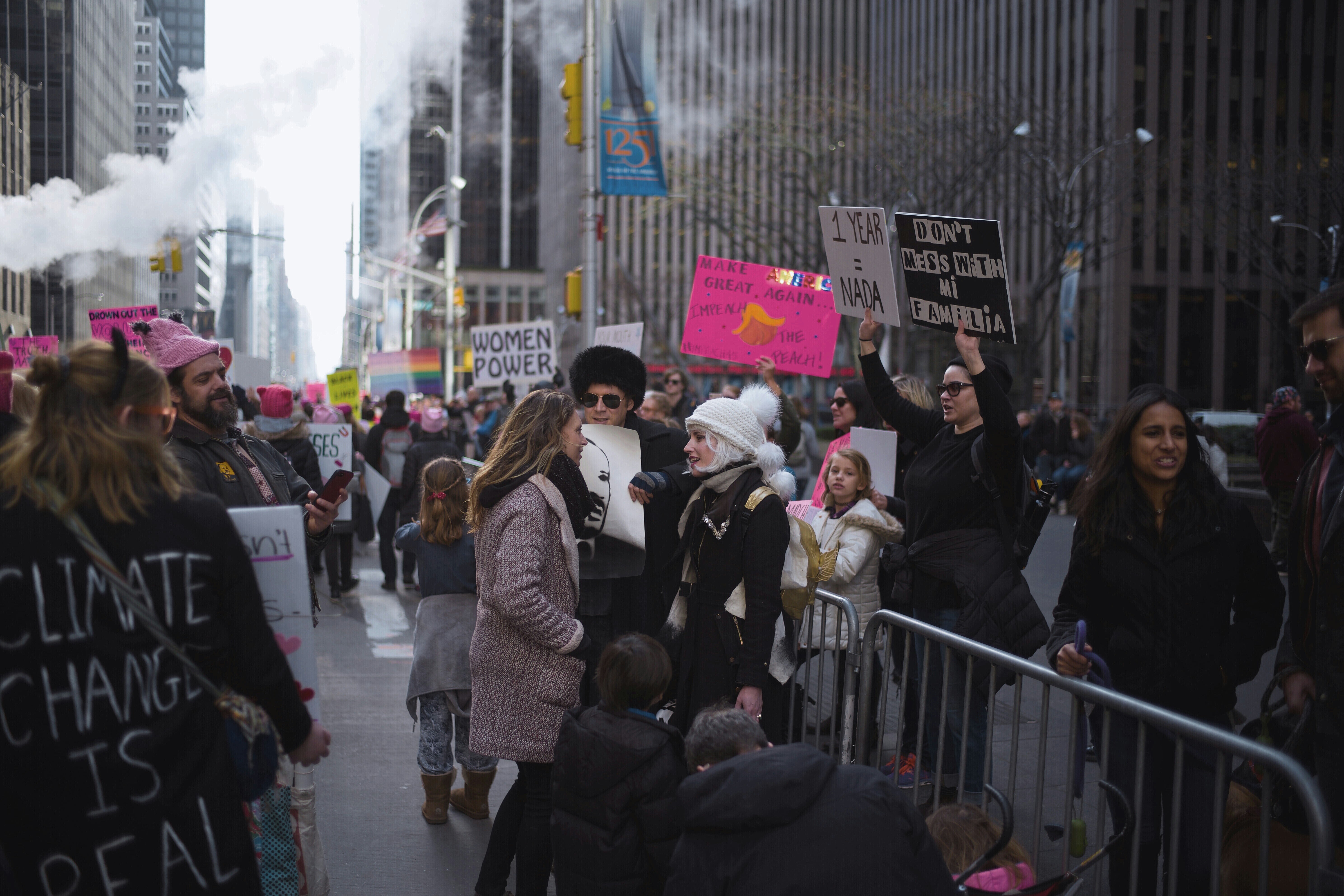 朋友,游行,抗议,海报,标志,纽约,女人,帽子,烟雾,蒸汽,气候变化,朋友