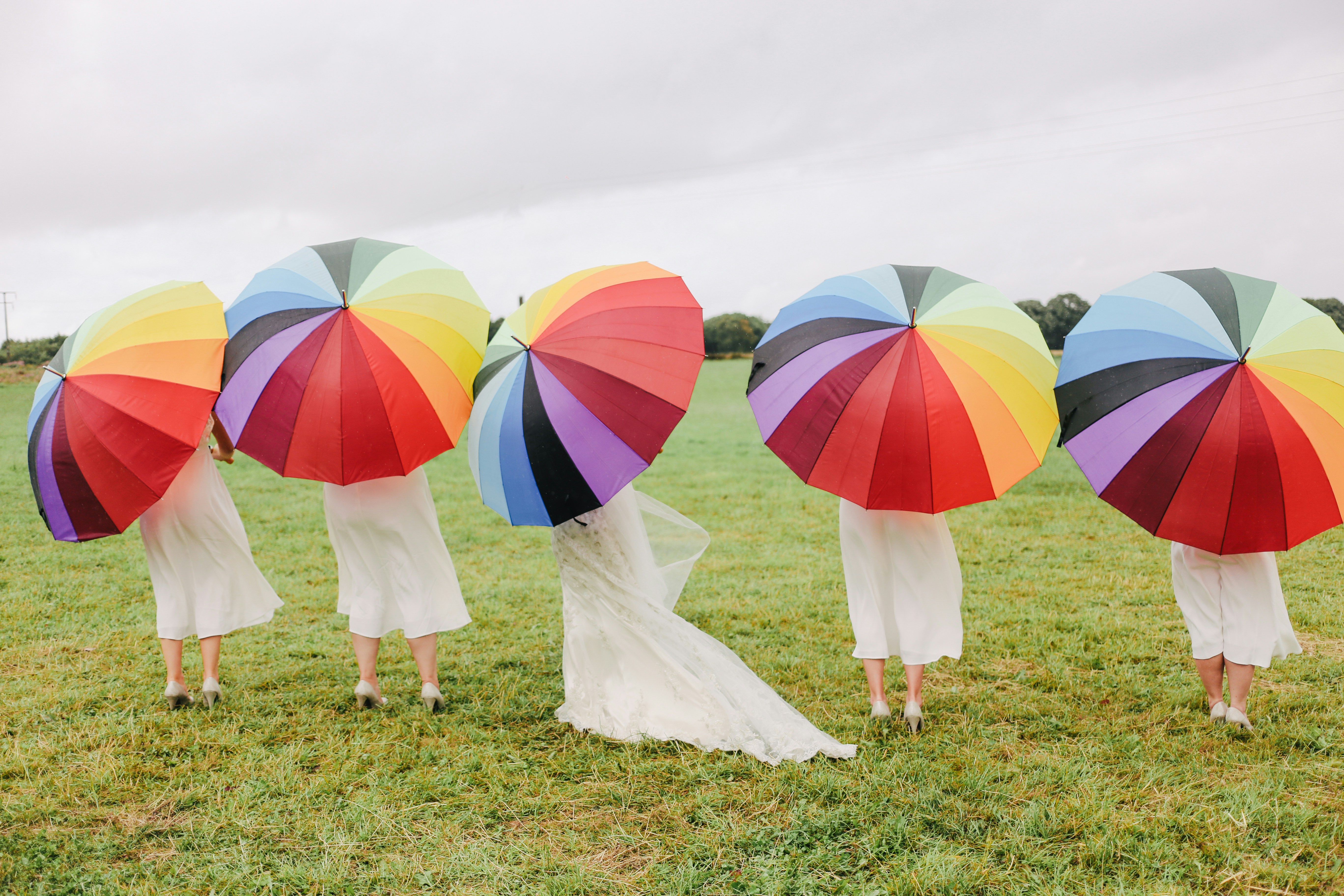 雨伞,人,女人,田野,草地,团体,彩虹,配对,圆圈,颜色,颜色,衣服,白色,雨,婚礼,新娘