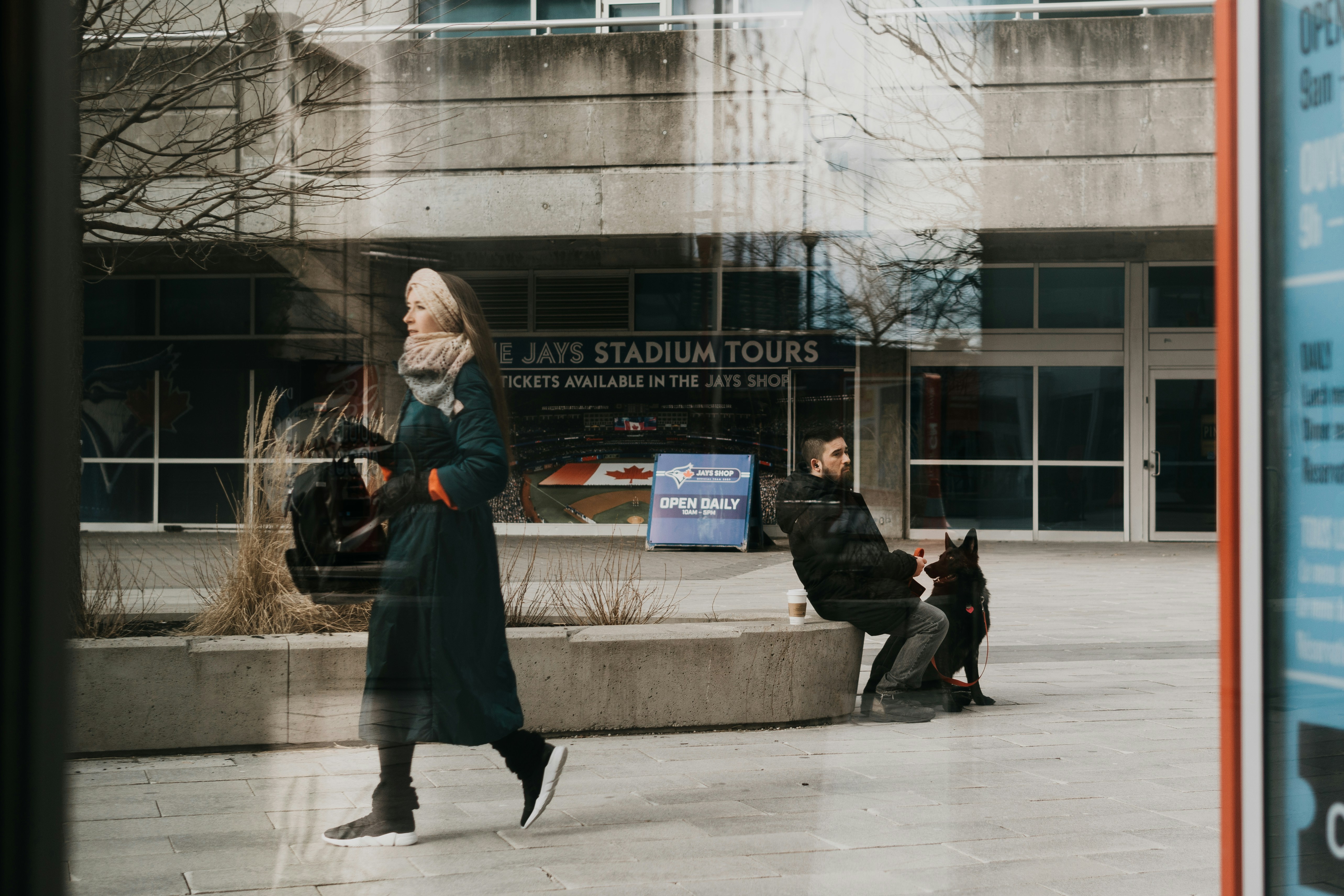 城市,狗,建筑,人,步行,动物,宠物,坐下,男人,女人,玻璃,窗户,街道,反射,CN塔,沃金,多伦多