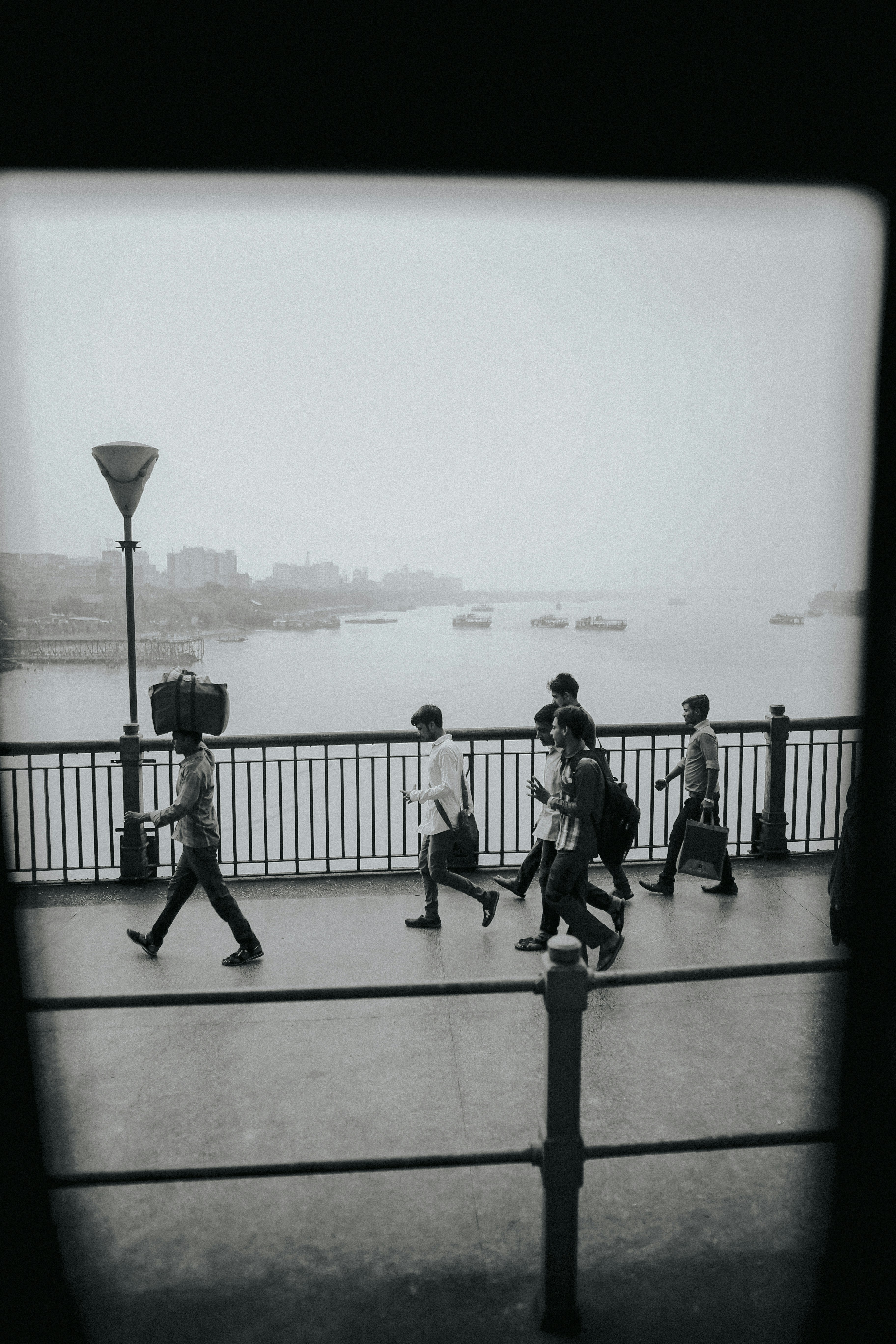 人、城市、河流、水、团体、谈话、散步、铁路、黑白、冒险、道路、公共汽车、栏杆、白、黑、黑、白、流浪、船、建筑、旅游