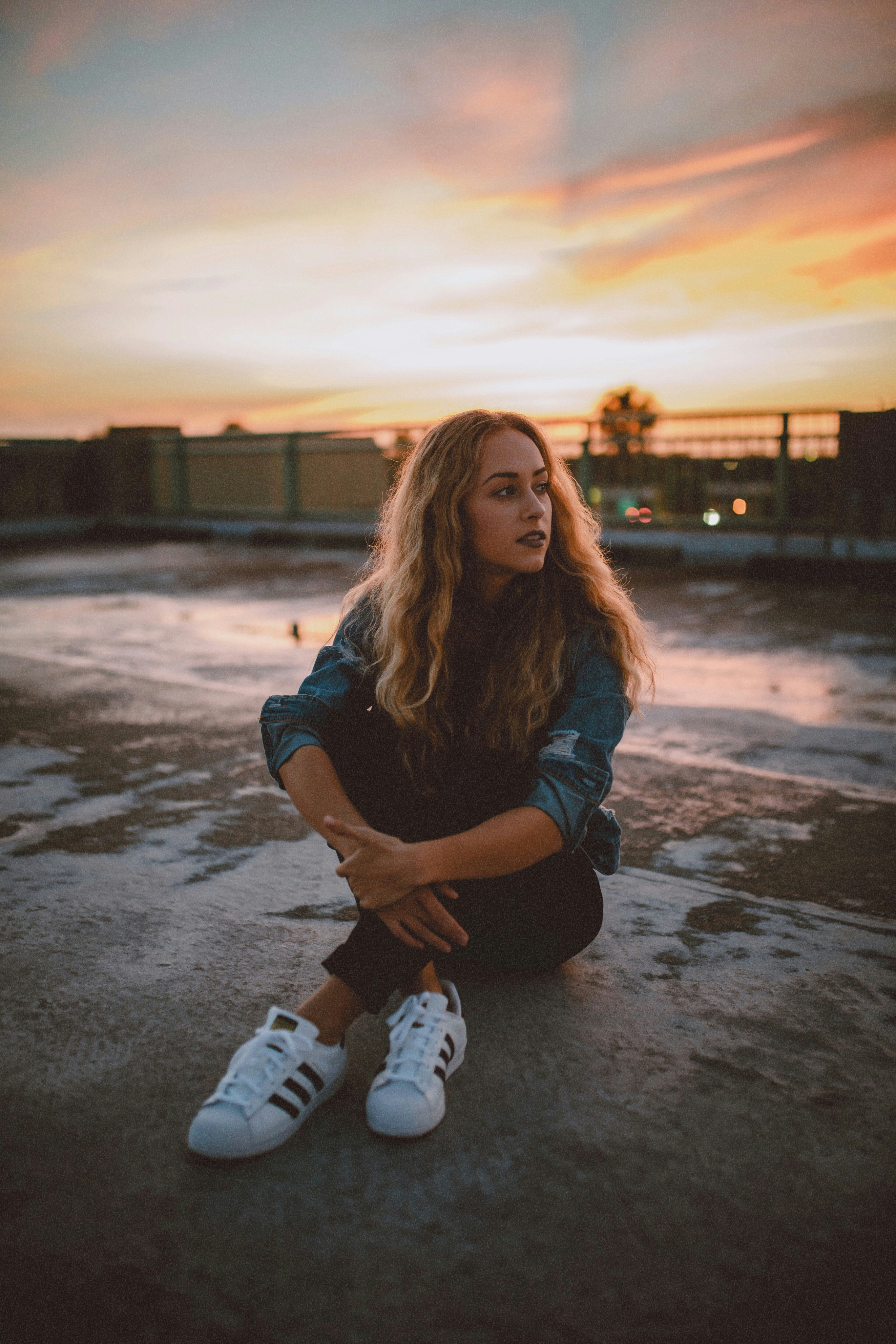 女人,女孩,阿迪达斯,金发,头发,日落,夜晚,黑暗,桥,日出,黎明,黄昏,牛仔夹克,屋顶,街道,阿迪达,市中心,坐,看,看