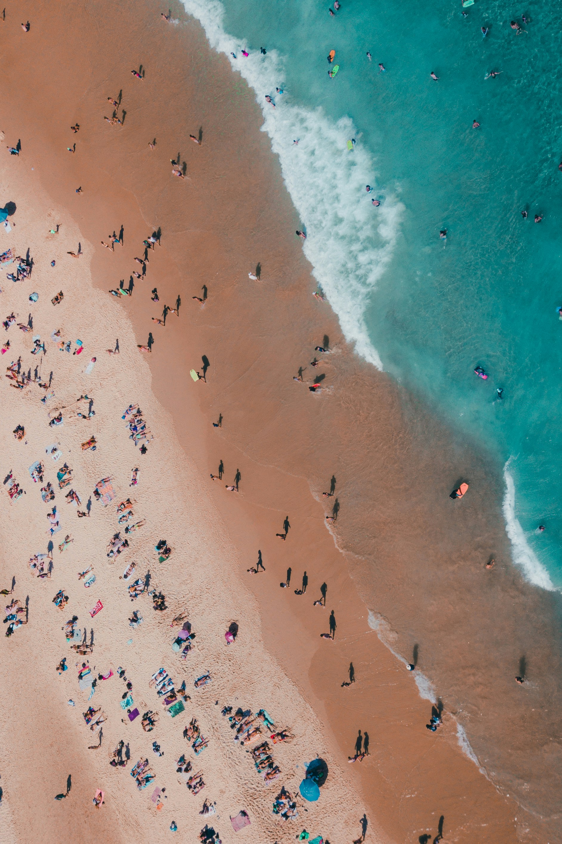 无人机视图,鸟瞰图,海滩,假日,冲浪,人,人群,阳光,乐趣,旅行,水,海,放松,DJI,无人驾驶飞机,冲浪者,清澈,沙滩