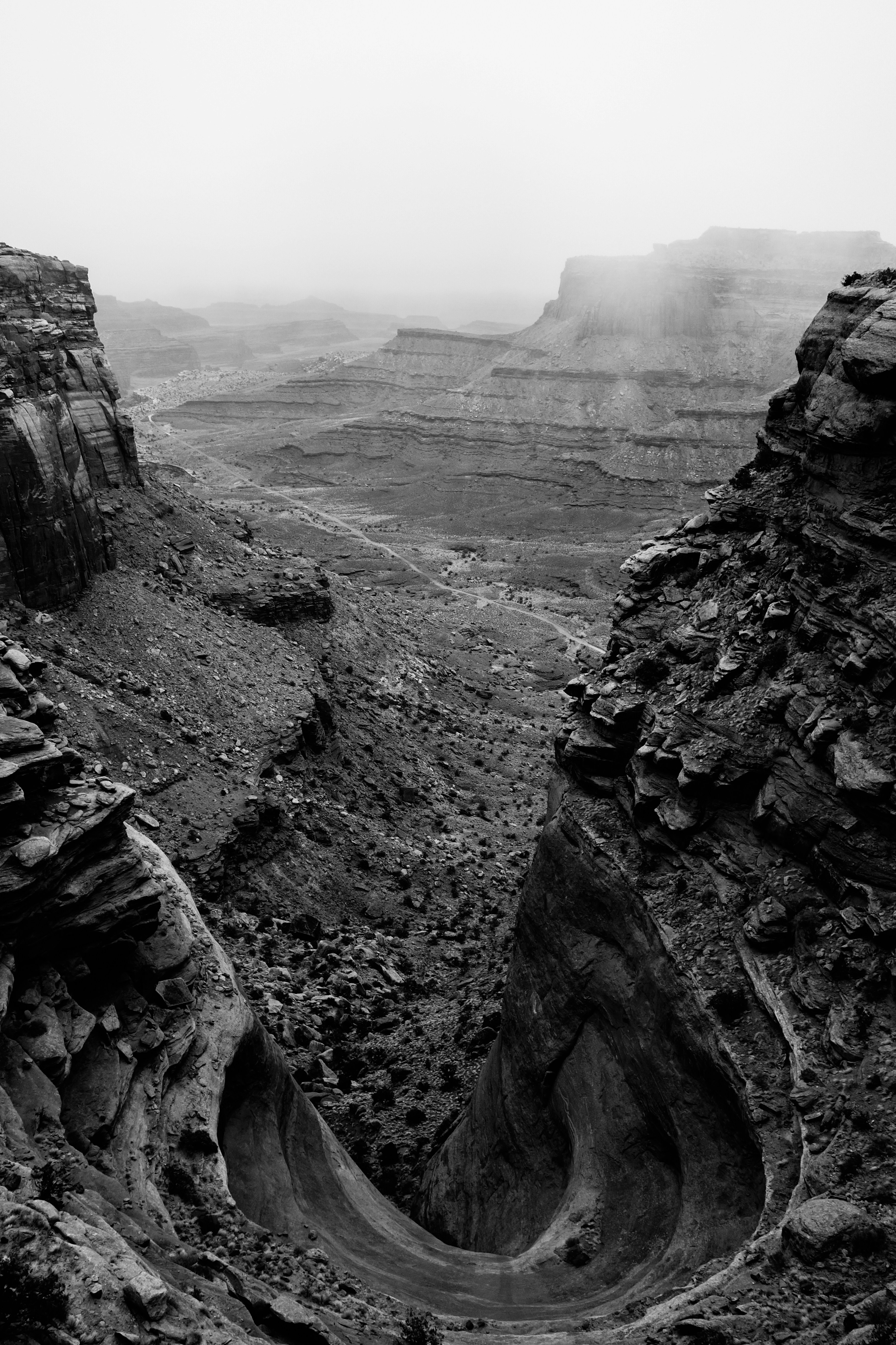 mountain,clouds,canyon,rocks,nature,black and white,outdoors,road,desert,canyonland,canon land,cloud,fog,b&w,soil,rock,usa,dirt,grand canyon