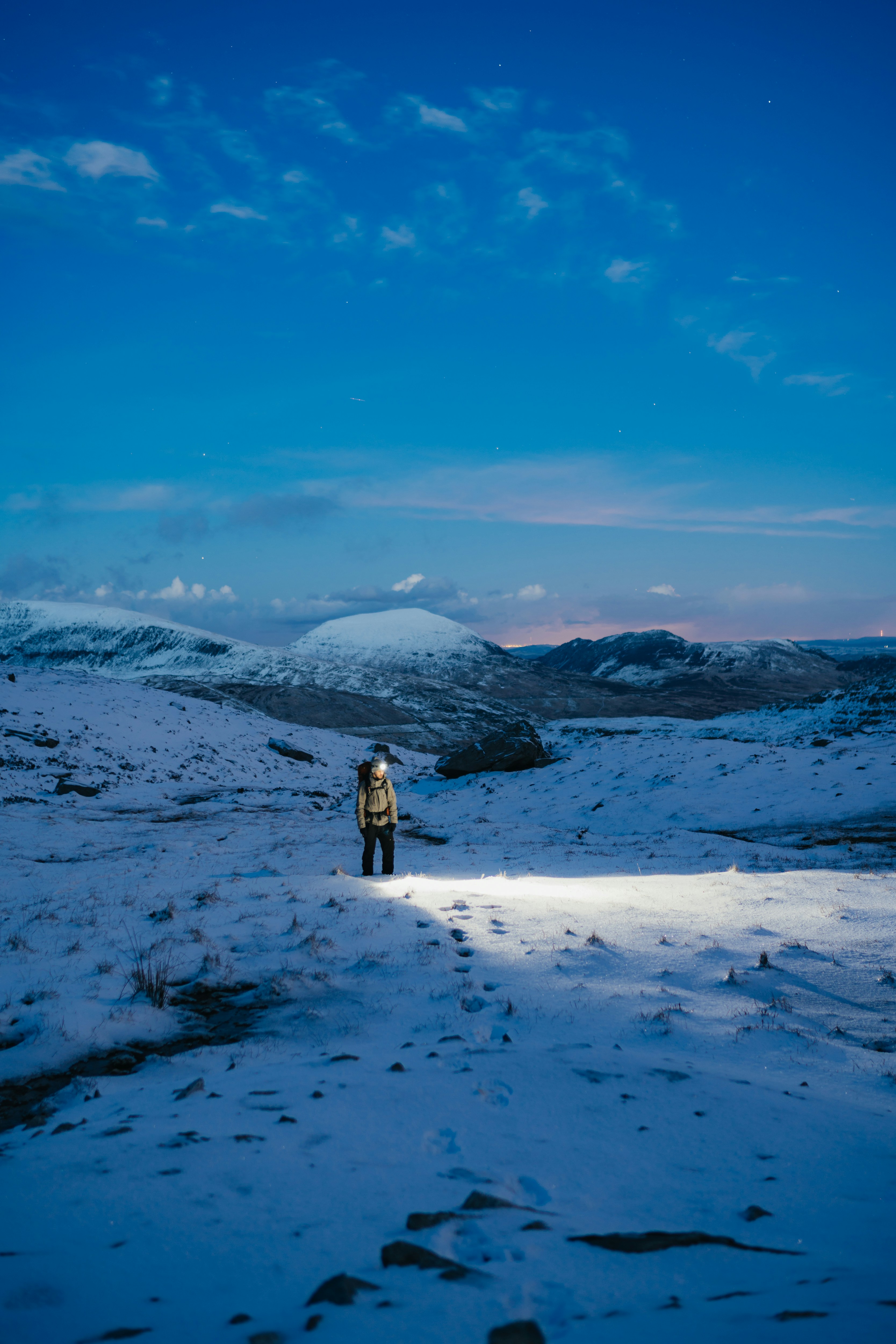 standing,hiking,headtorch,mountain range,adventure,night,late,man,hike,light,nature,snowcapped,view,amazing,mountain,lamp,landscape,night time,early morning,traveling