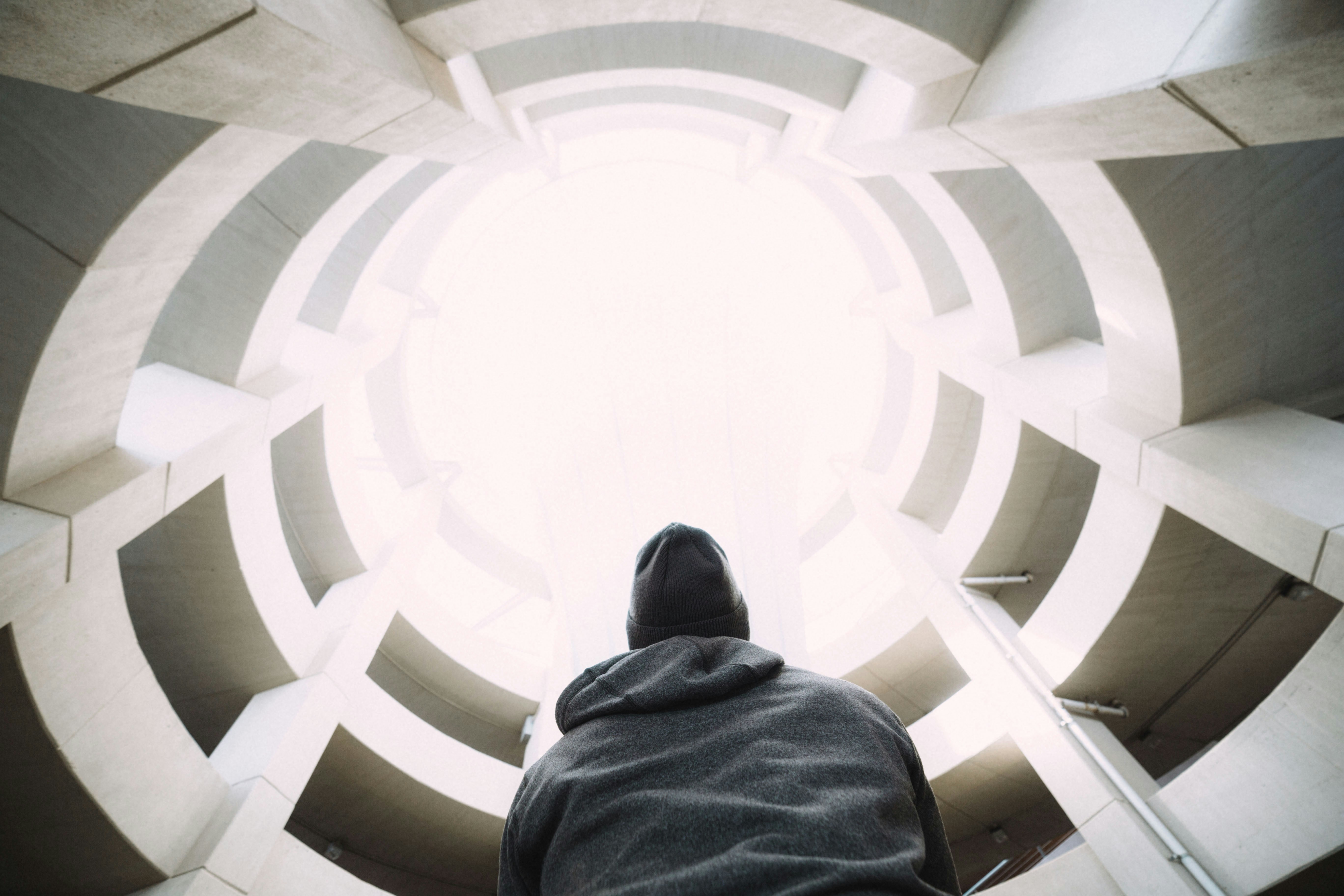 一个戴着帽衫的人和一个望着混凝土井底的豆荚
