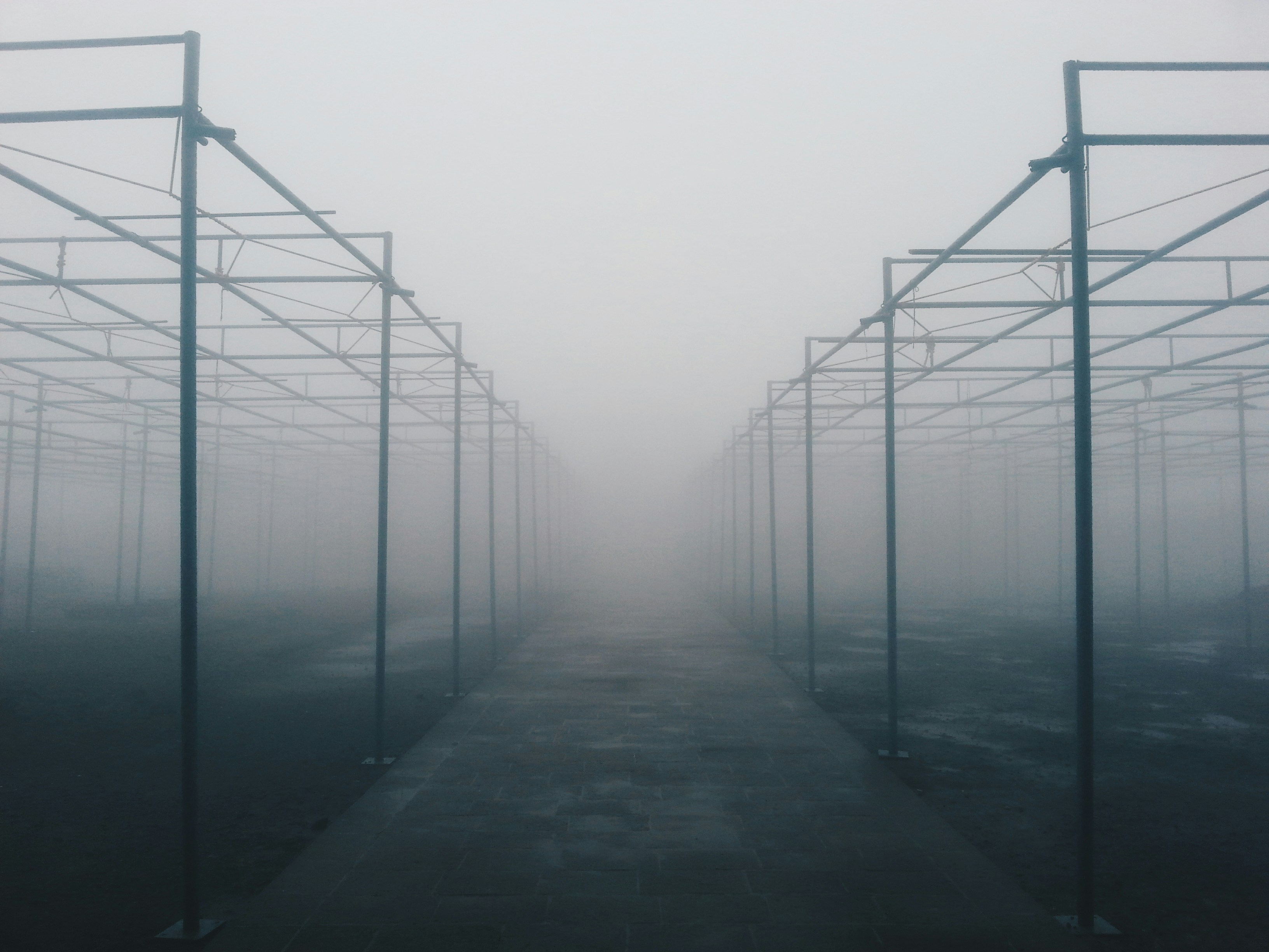 背包、背包客、黄夹克、下雪、散步、独处、寒冷、街道、人行道、冬天、棕色、外套、冬衣、黄色、雾、雾、旅游、山、松、探险家