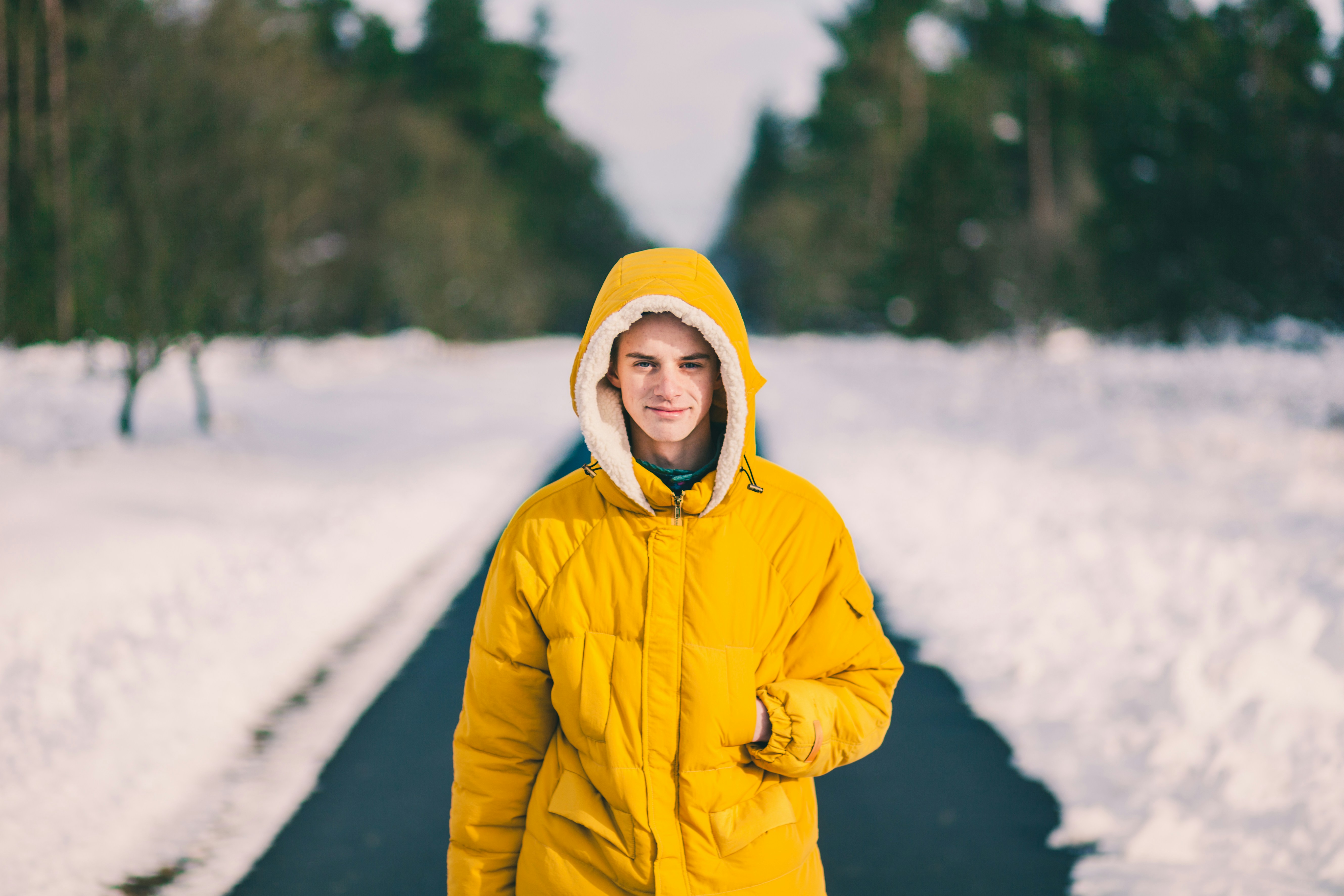 黄色、大衣、冬天、雪、树木、林地、森林、公园、白色、小径、道路、风景、山、松树、探险家、肖像、木头、冒险、旅行者、旅游