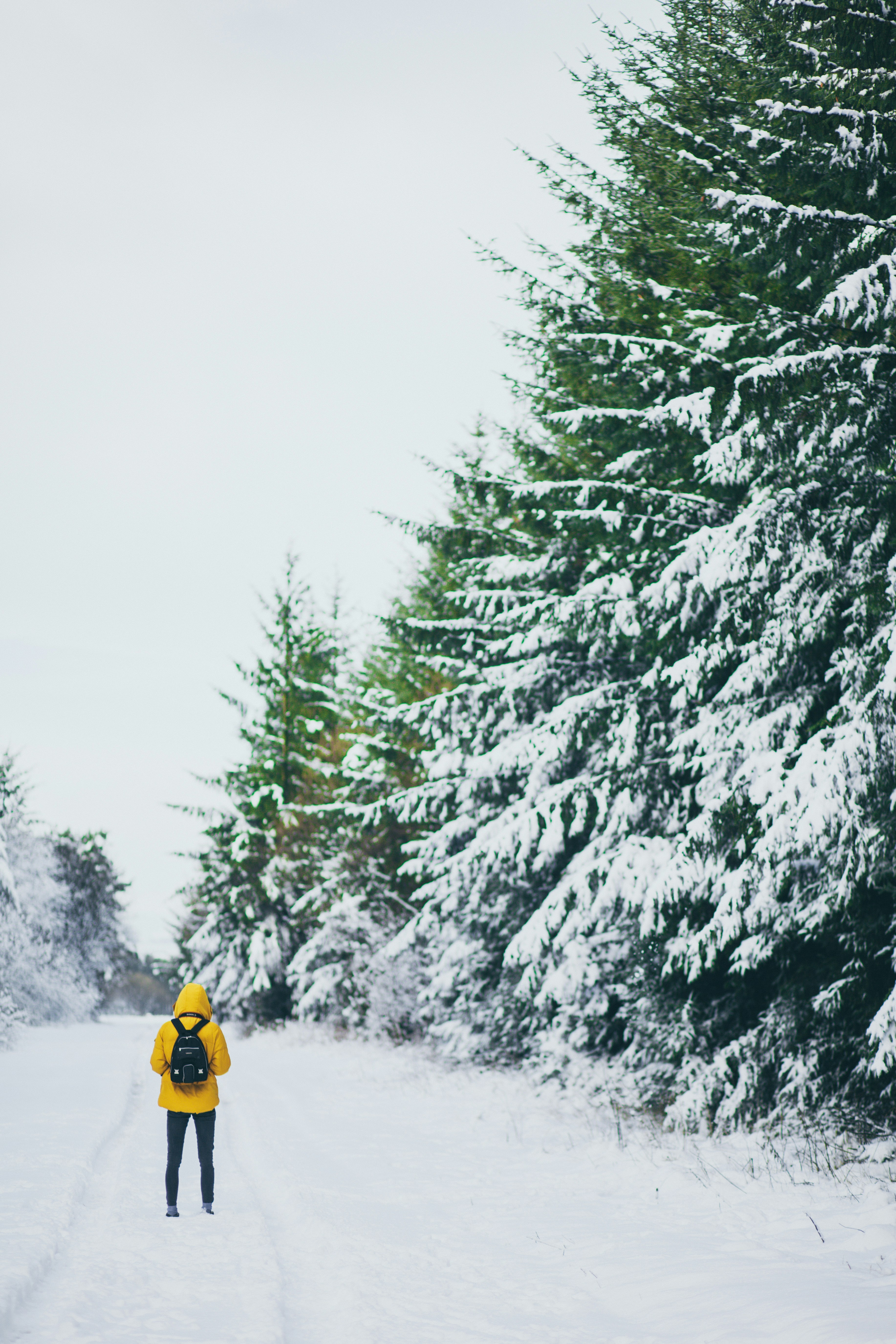 雪,冬天,树木,林地,森林,松树,黄色,外套,背包,山,松树,探险家,肖像,木头,冒险,旅行者,旅行,脸谱,instagram,阴影