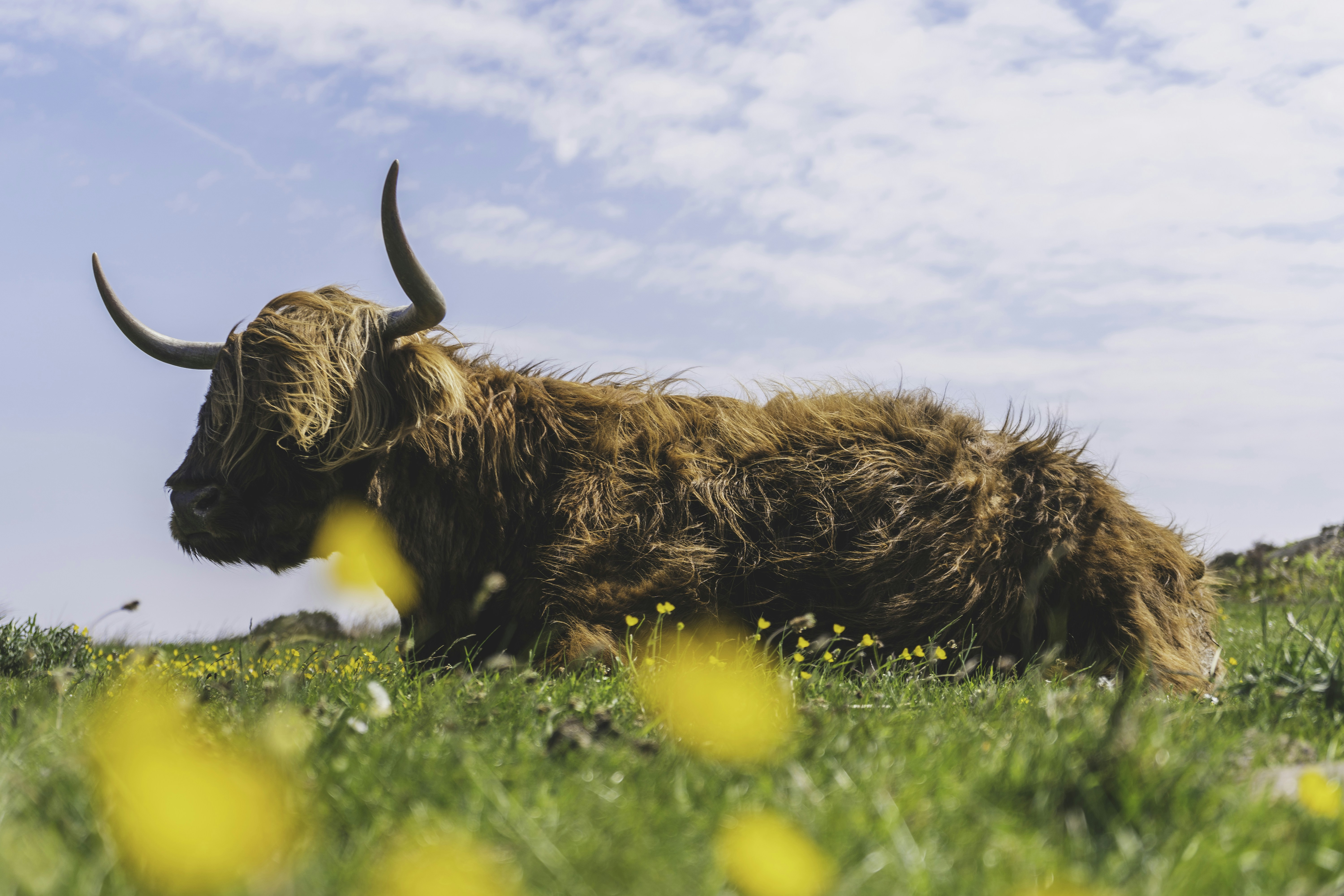 角、牛、毛、牲畜、农场动物、田野、花朵、天空、自然、多毛、明亮、阳光、户外、索尼·阿尔法、索尼、孤独的行星、长发、可爱的树、山峰