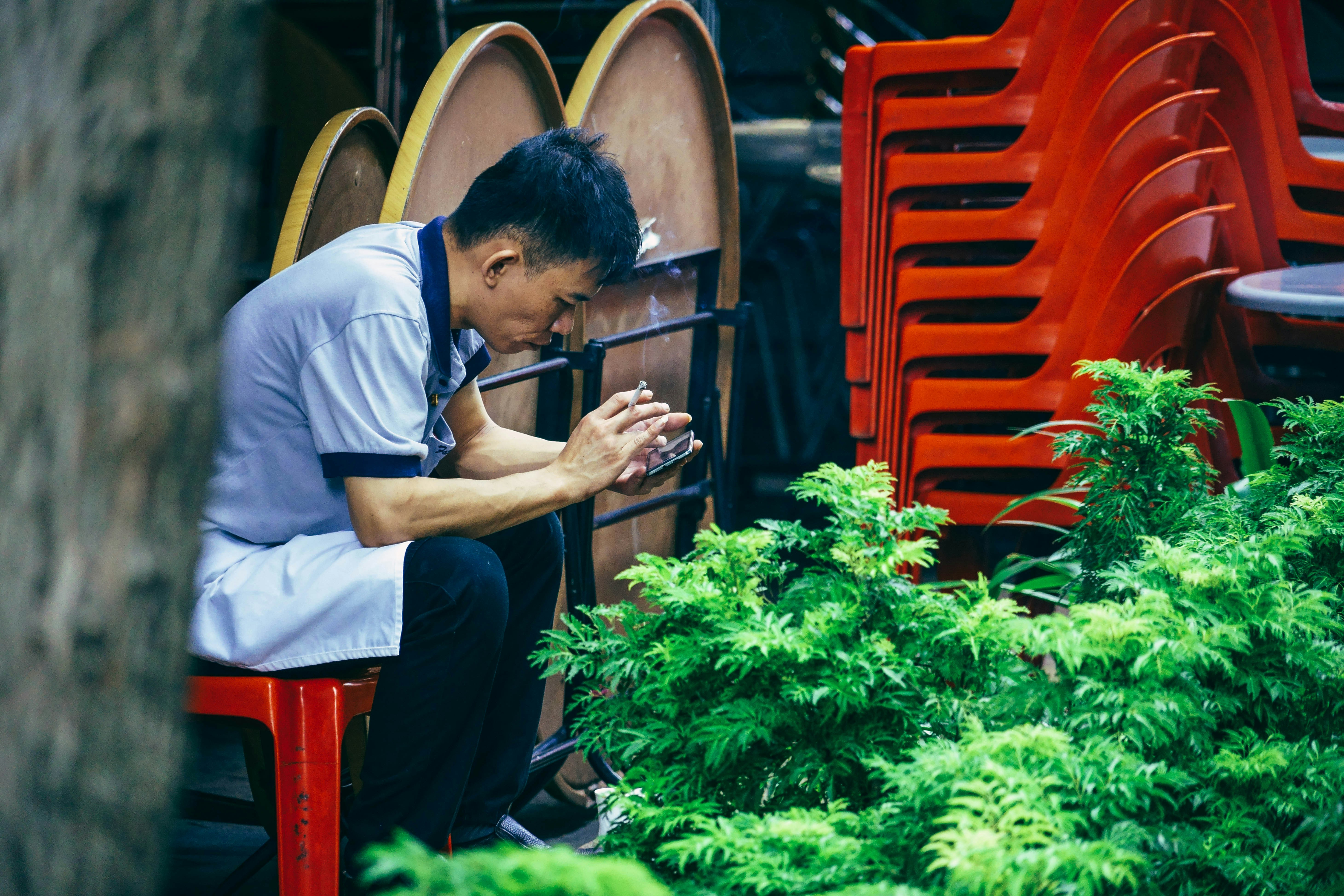 man,guy,male.asian,smoker,smoking,cigarette,texting,holding,mobile phone,sitting,sit,chair,pile,person,,unhealthy,tobacco,smoke,bad,addiction