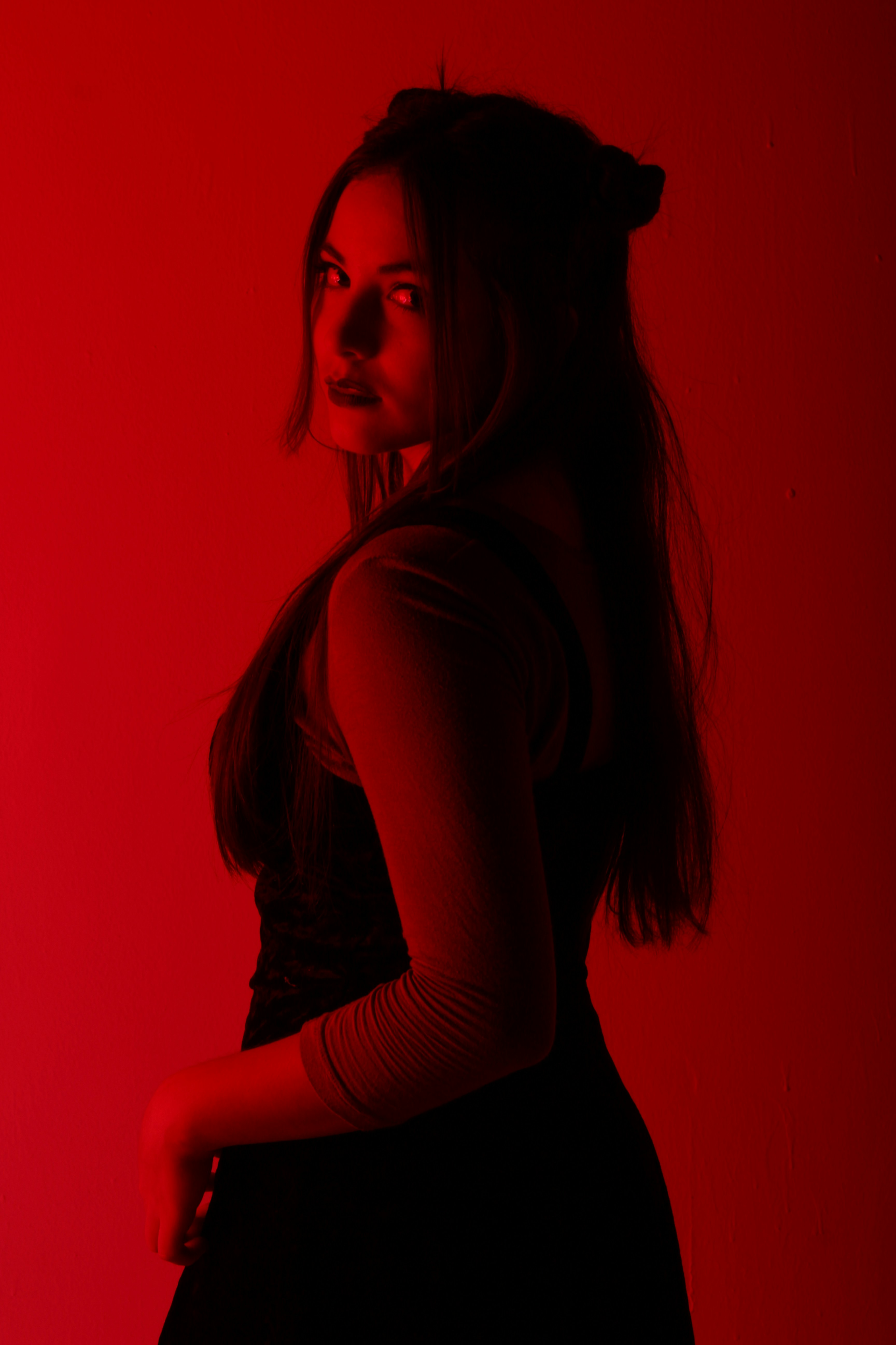一个长着红色头发的长发模特看着她的肩膀对着摄像机。