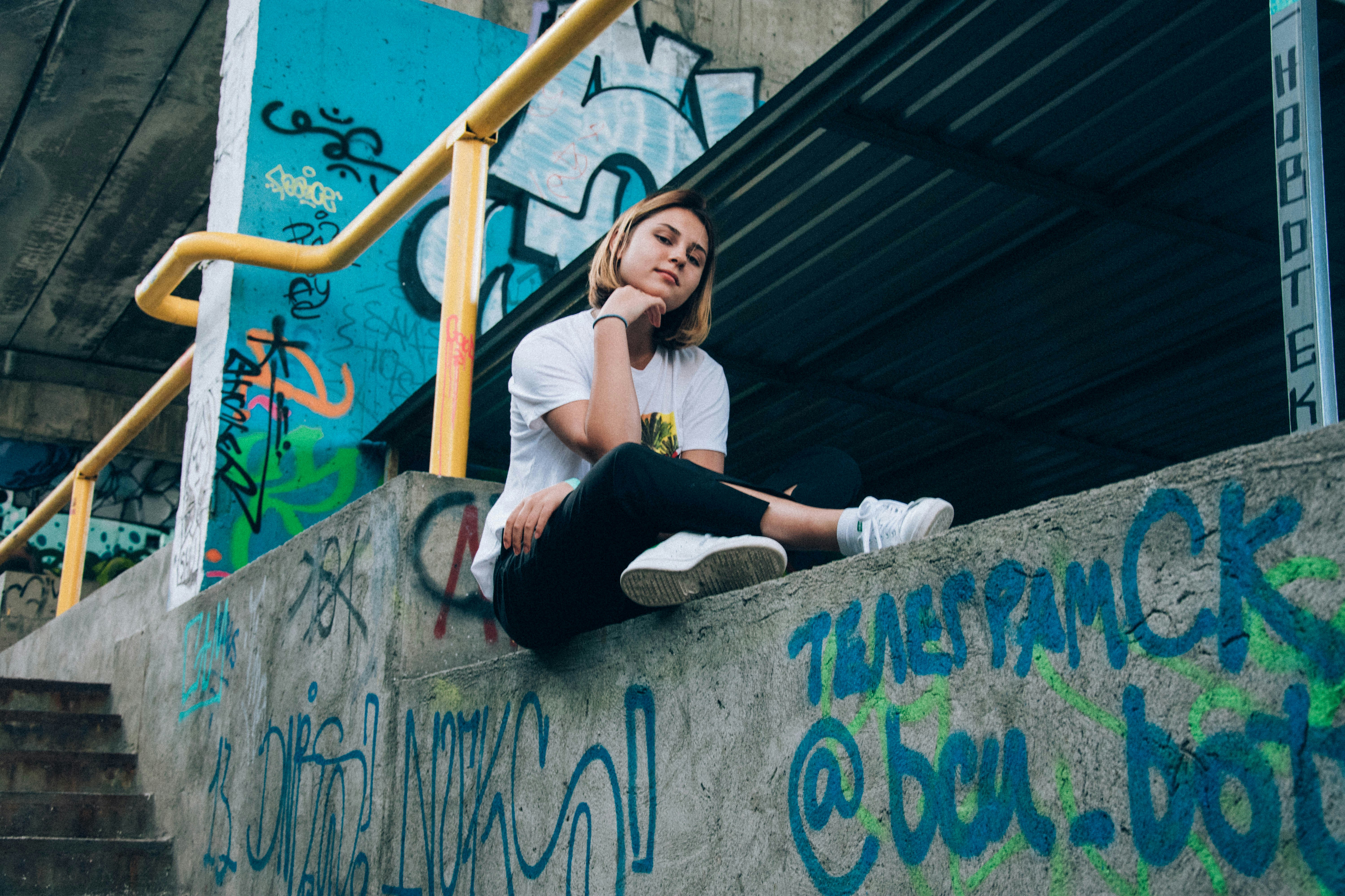 穿着白色T恤的女人在楼梯和黄色栏杆上涂抹着水泥墙。