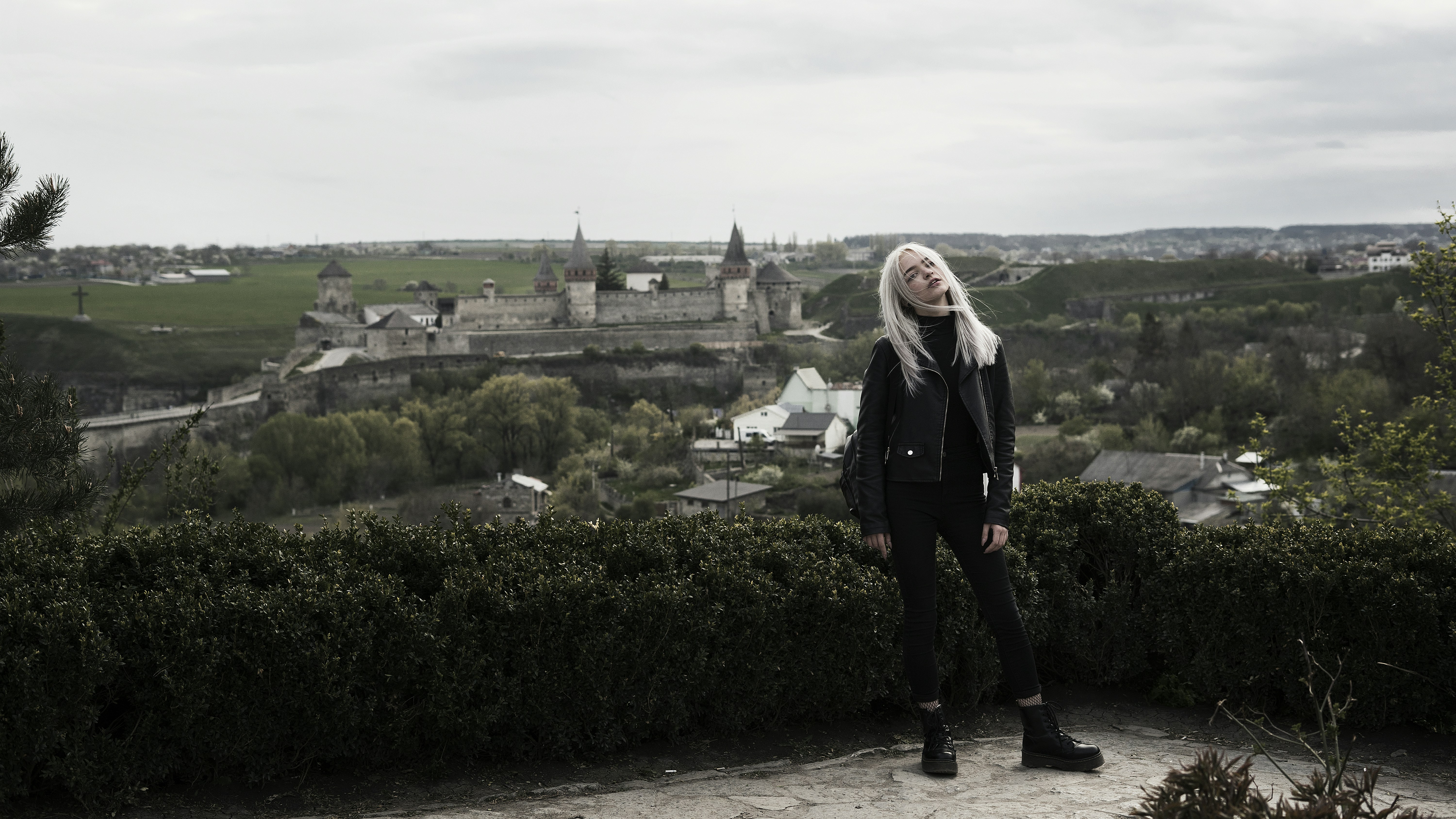 年轻的女人在粉红色的烟云面前显得愁容满面。