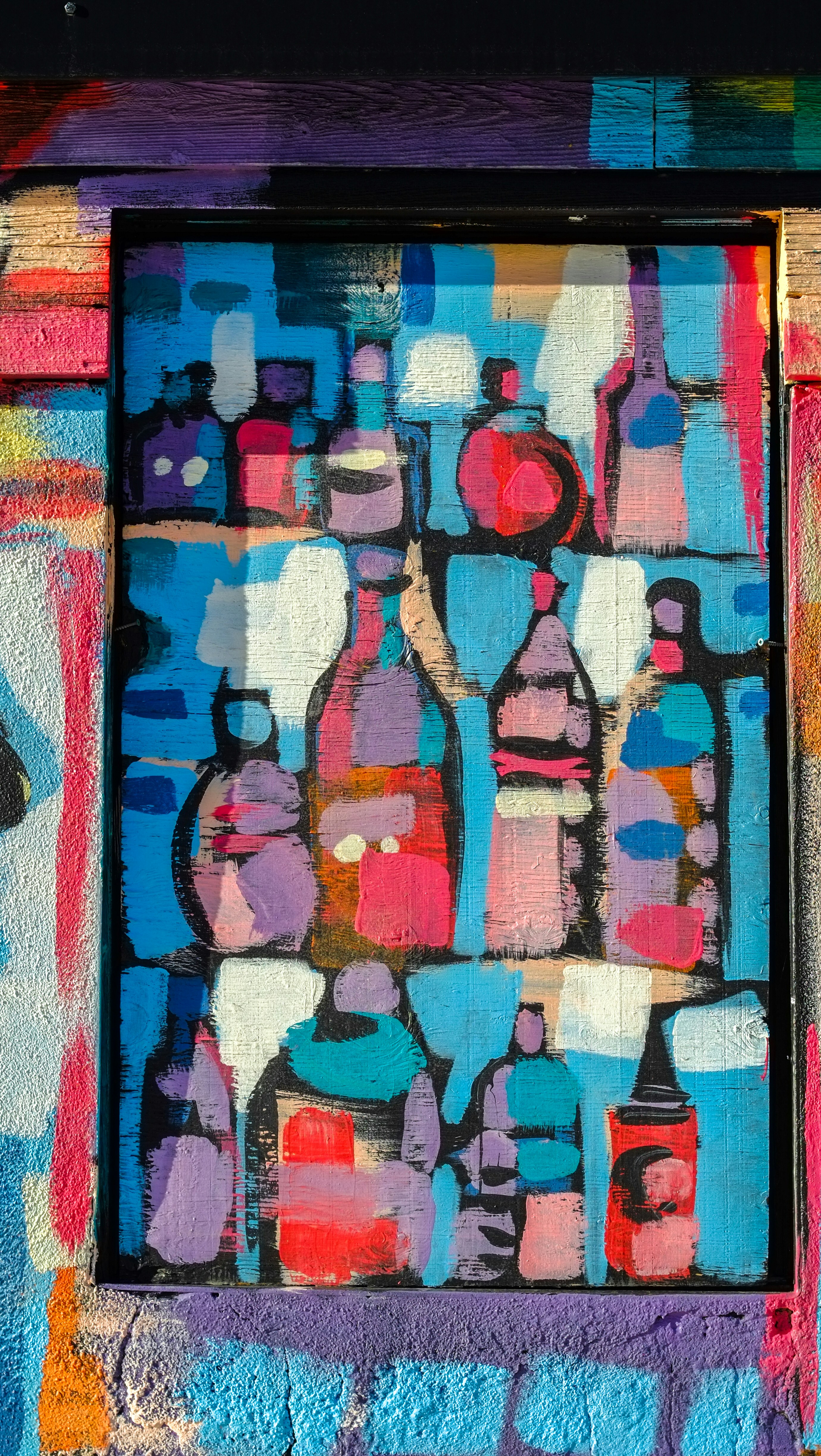 街头艺术,墙壁,涂鸦,瓶子,颜色,五颜六色,架子,蓝色,粉色,紫色,红色,阳光,阴影,绘画,酒瓶,城市艺术,壁纸