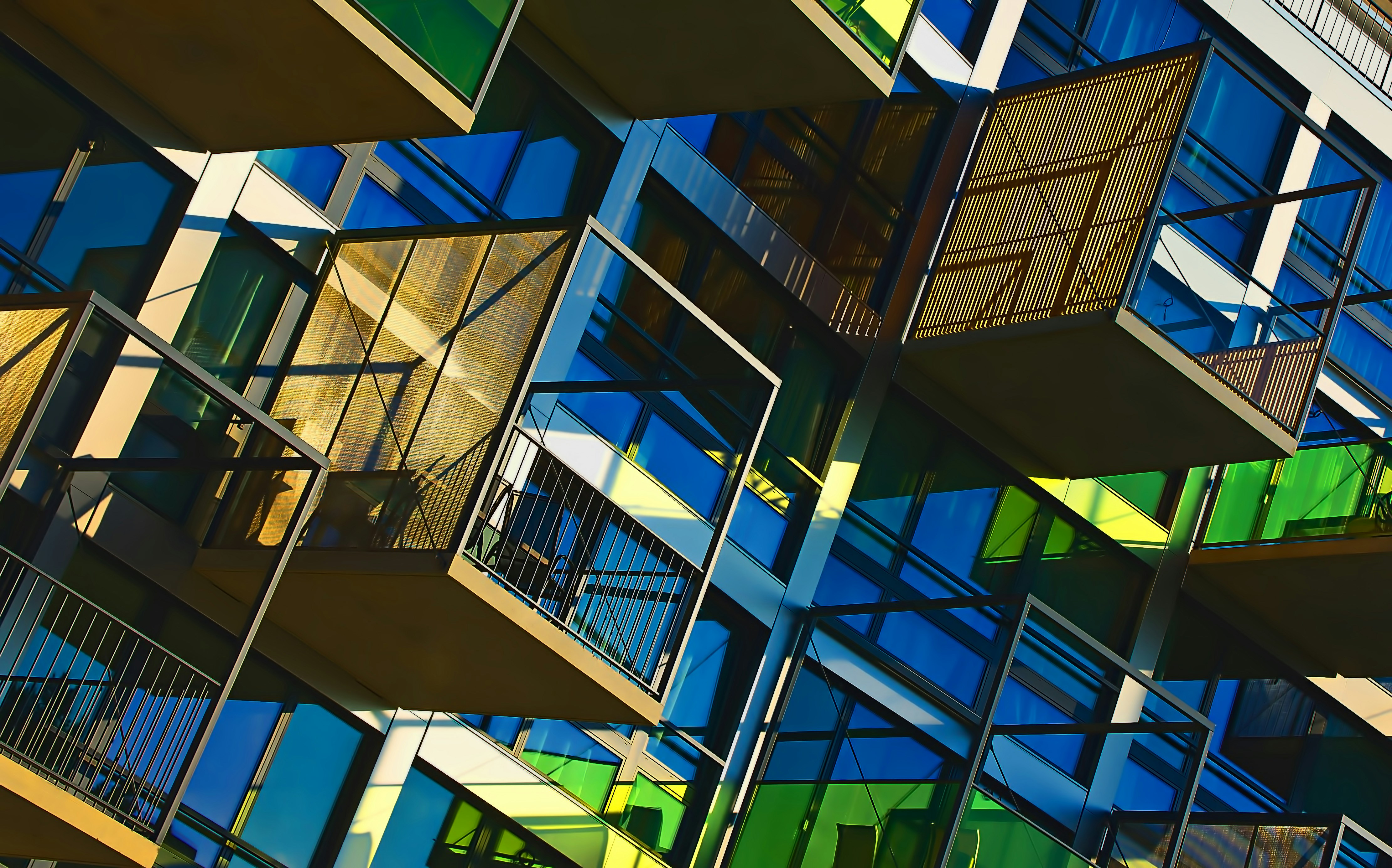 A modern apartment with green and blue windows and extended balconies as seen in Zürich.