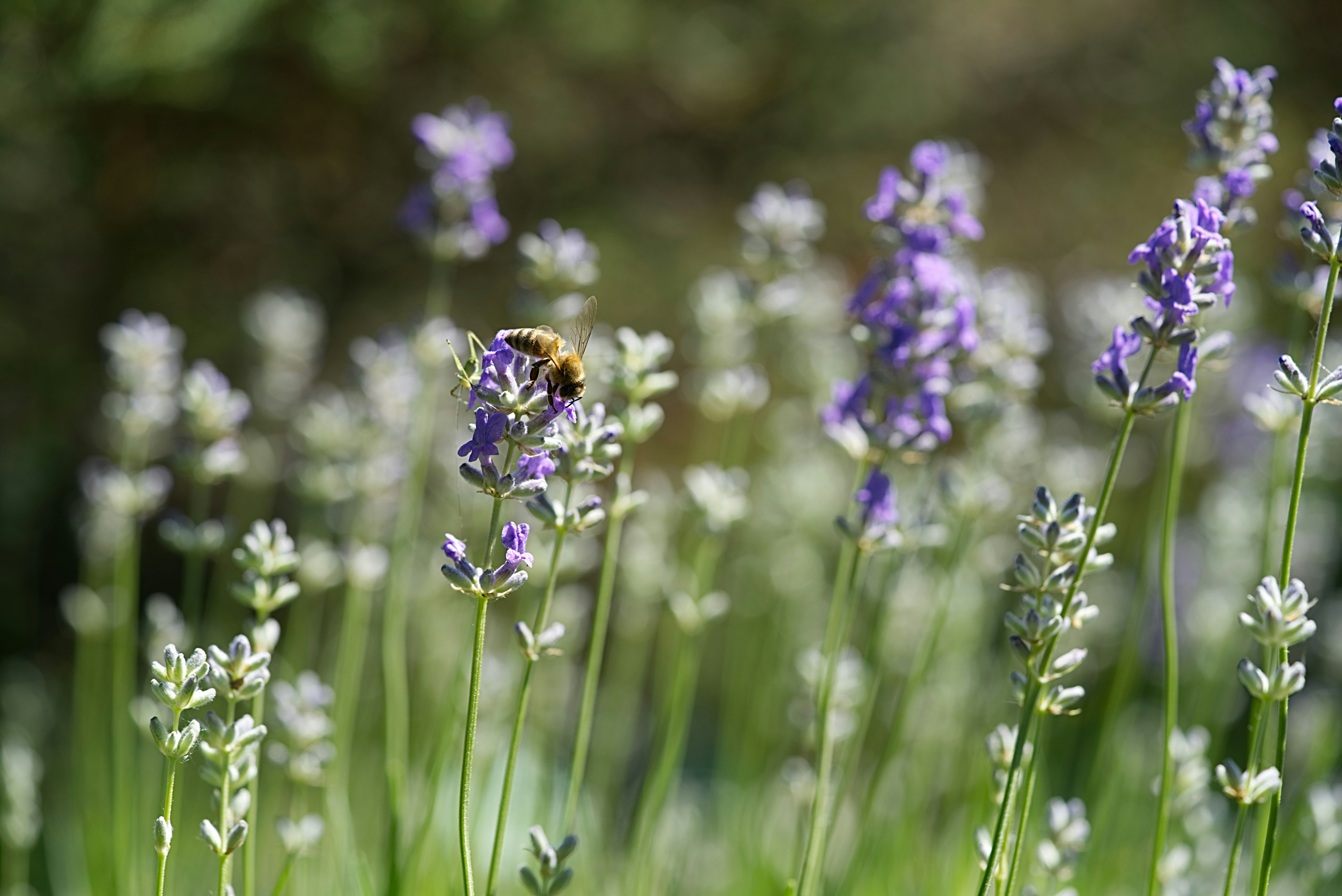 在薰衣草花上采集花粉的蜜蜂