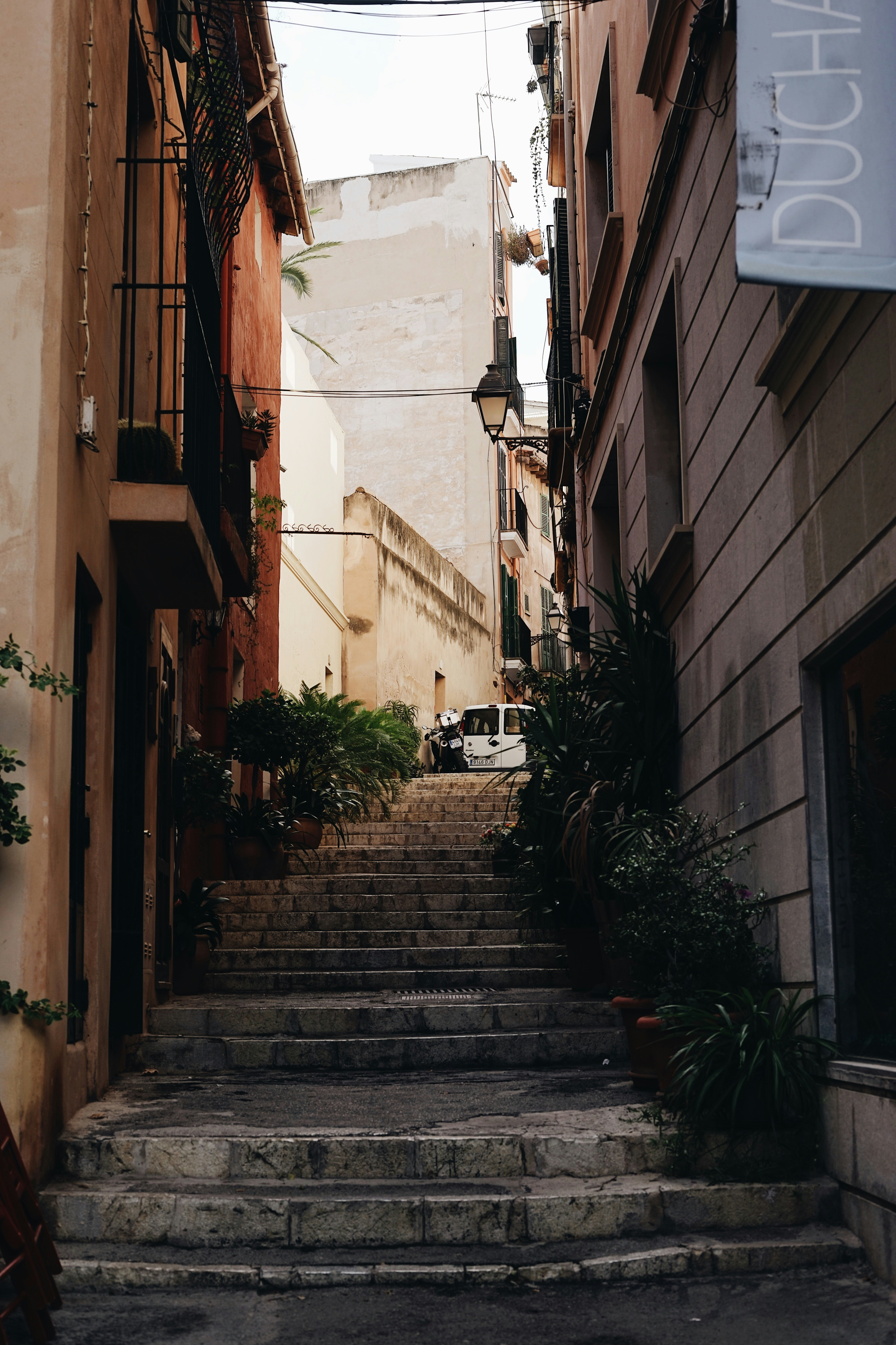 城镇、台阶、建筑、建筑、混凝土、石头、古董、灯笼、小巷、植物、窗户、颜色、阳光、无人、汽车、度假、城市、街道、树木、绿色