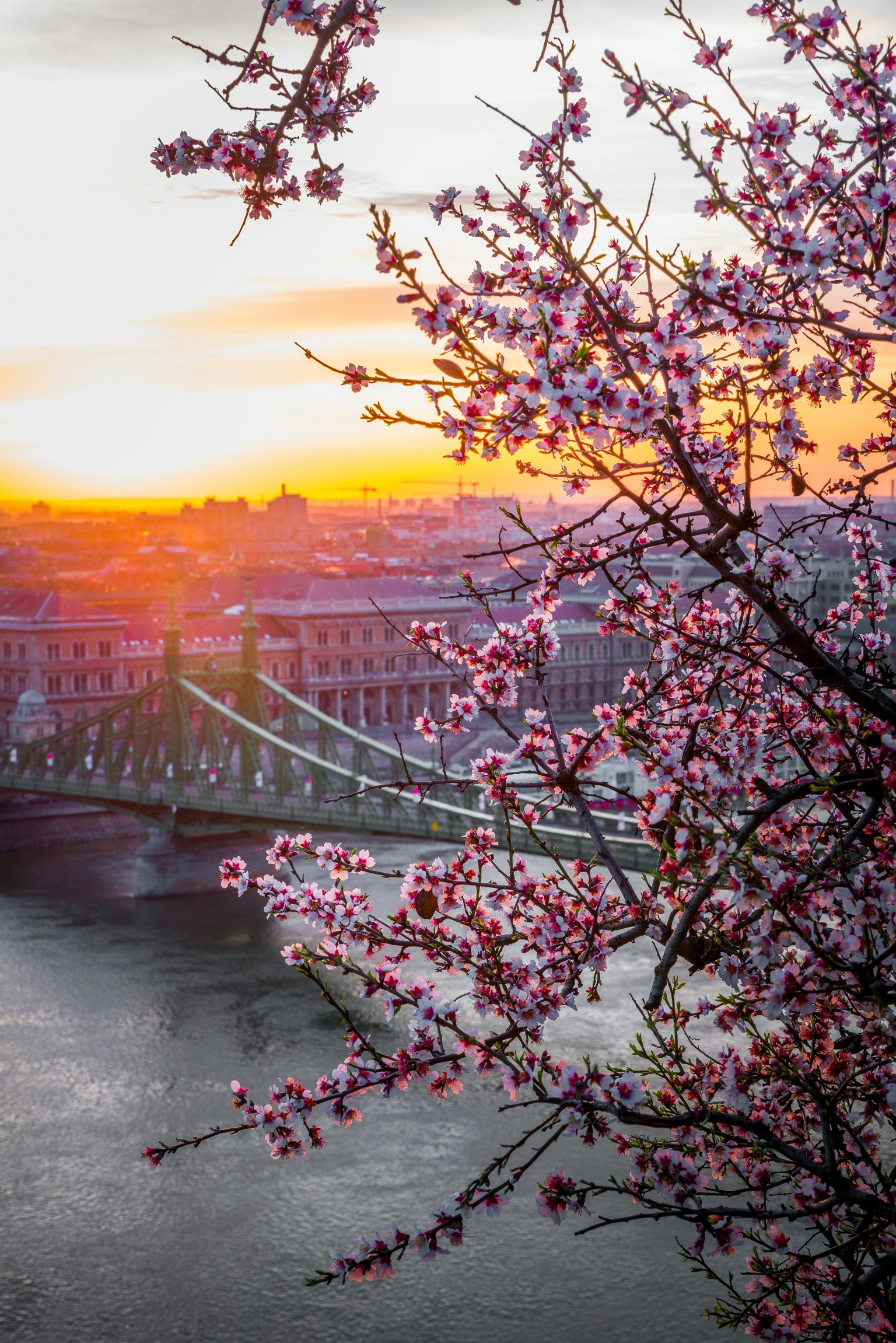 风景、树木、建筑、建筑、桥梁、日落、花朵、花朵、云朵、天空、太阳、匈牙利、河流、城市、城市、布达佩斯、树叶、春天、光辉、生命