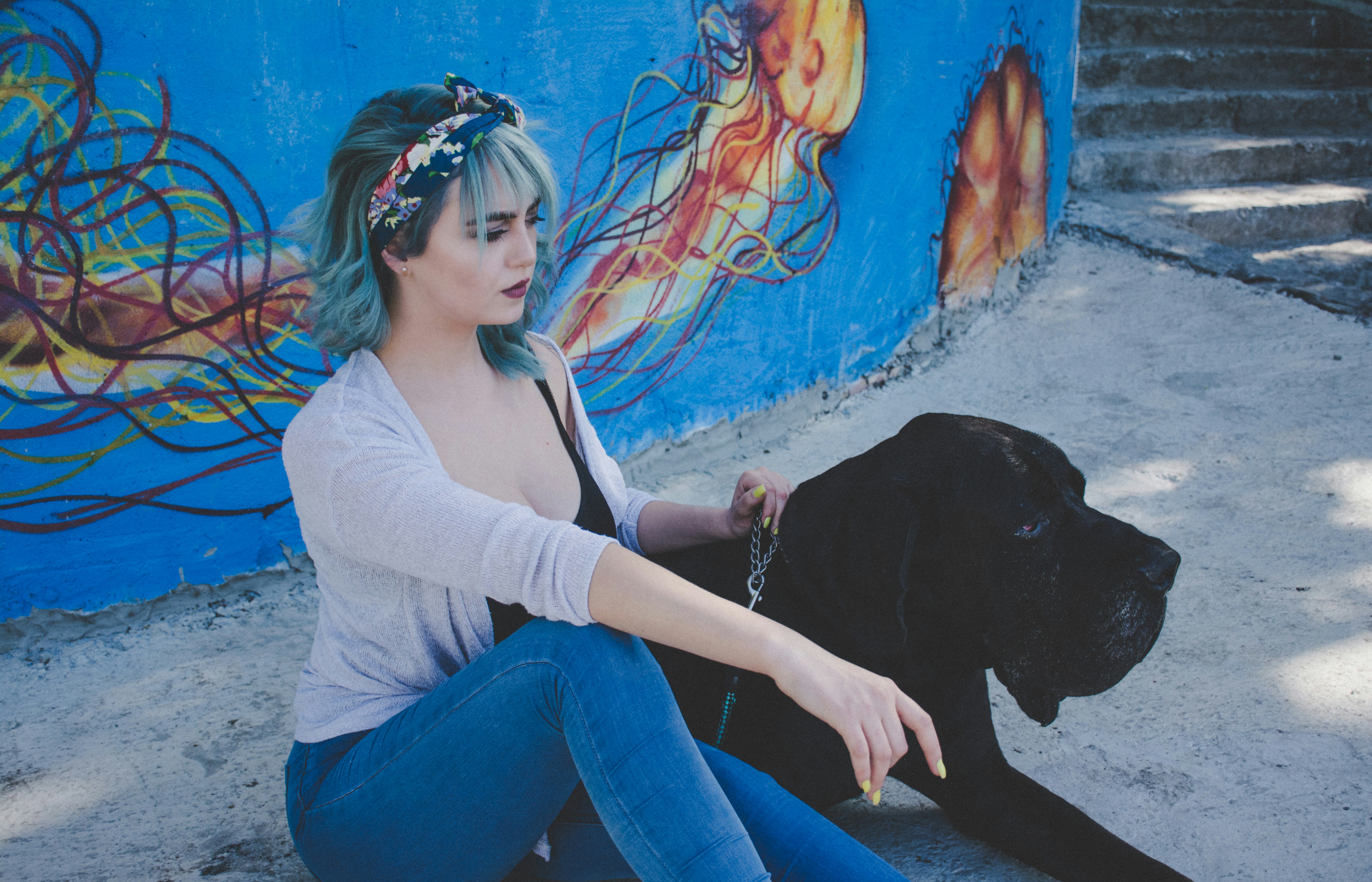 女人,狗,地,街,蓝,黑,白,动物,涂鸦,城市,宠物,爱,伴侣,配对,情侣,生活,姿势,模特,时尚,肖像