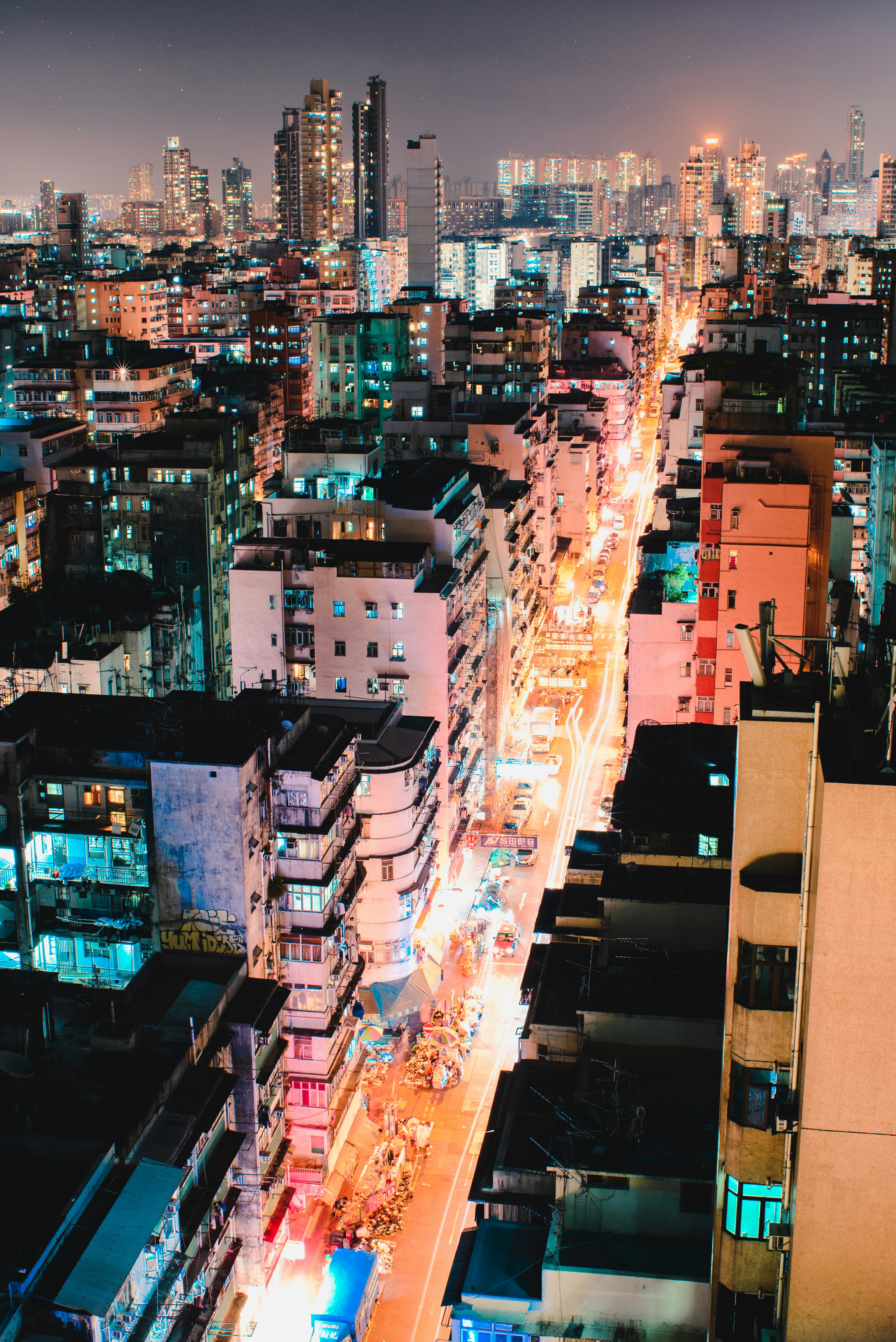 建筑,建筑,摩天楼,塔,灯,夜,黑暗,城市,紫色,亚瑟,香港