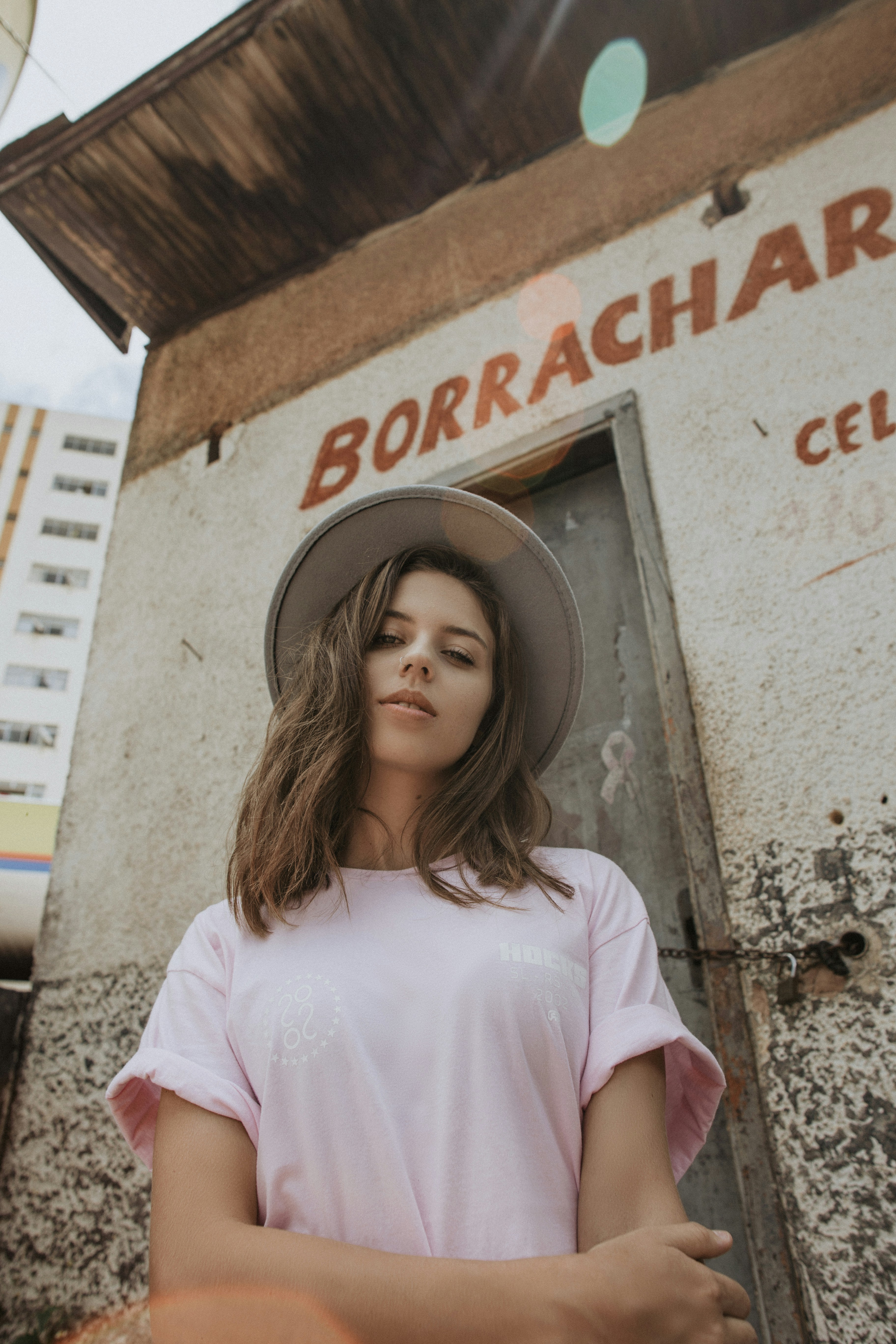 女性,面部,建筑,女人,女孩,人物,肖像,生活,帽子,T恤,夏天,姿势,时装,模特,复古,年份,粉红,肖像摄影