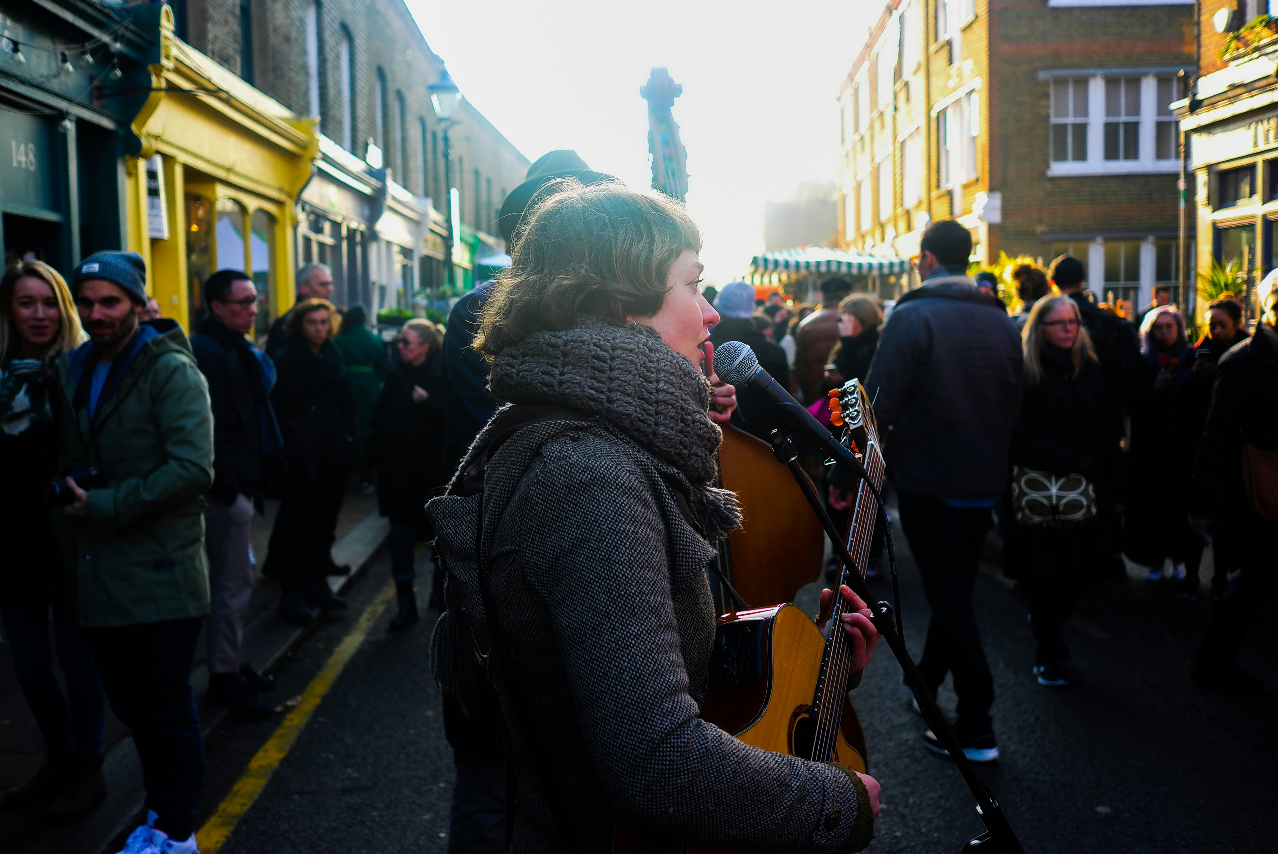 在一条拥挤的街道上弹吉他和对着麦克风唱歌的女人