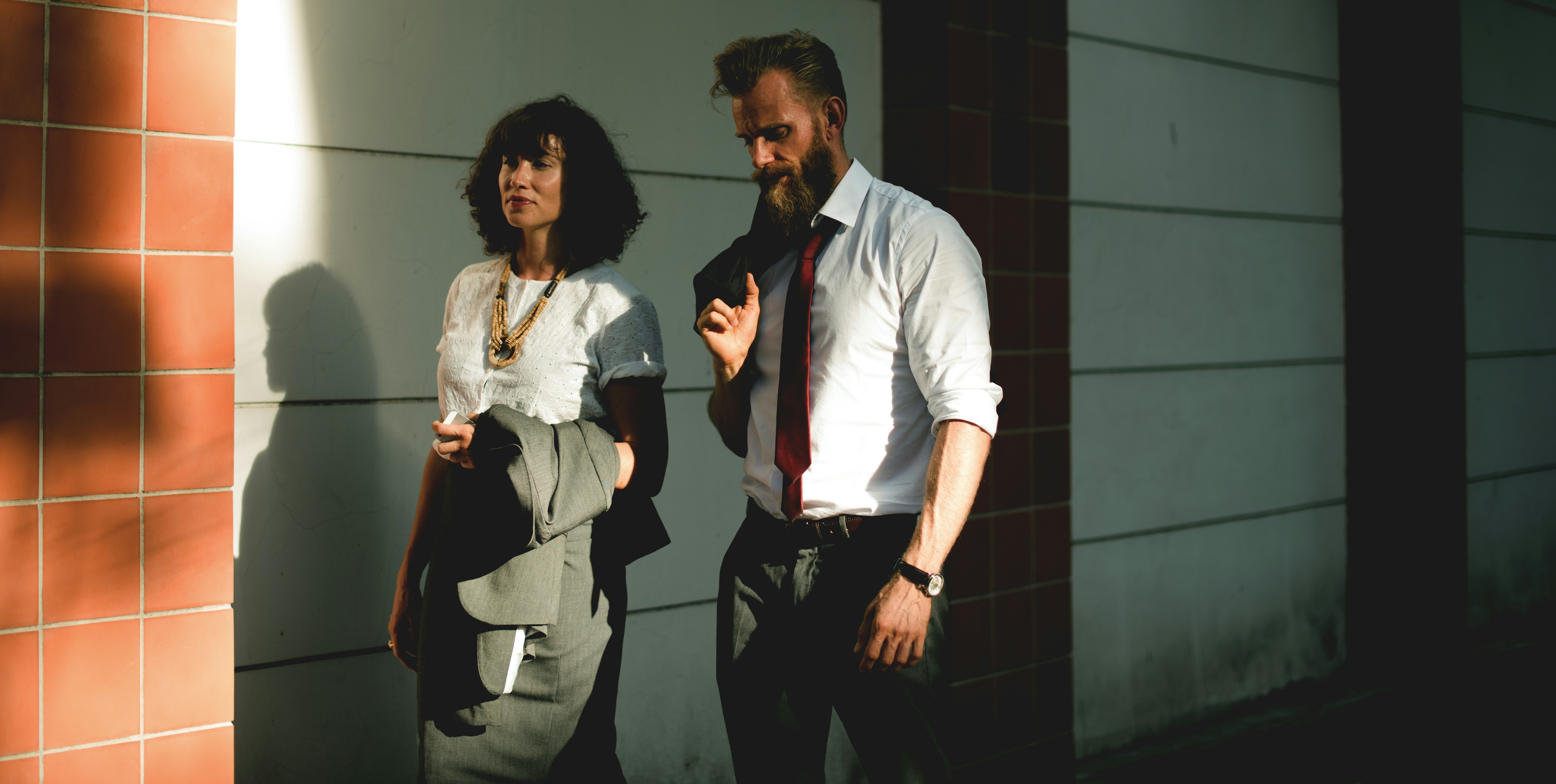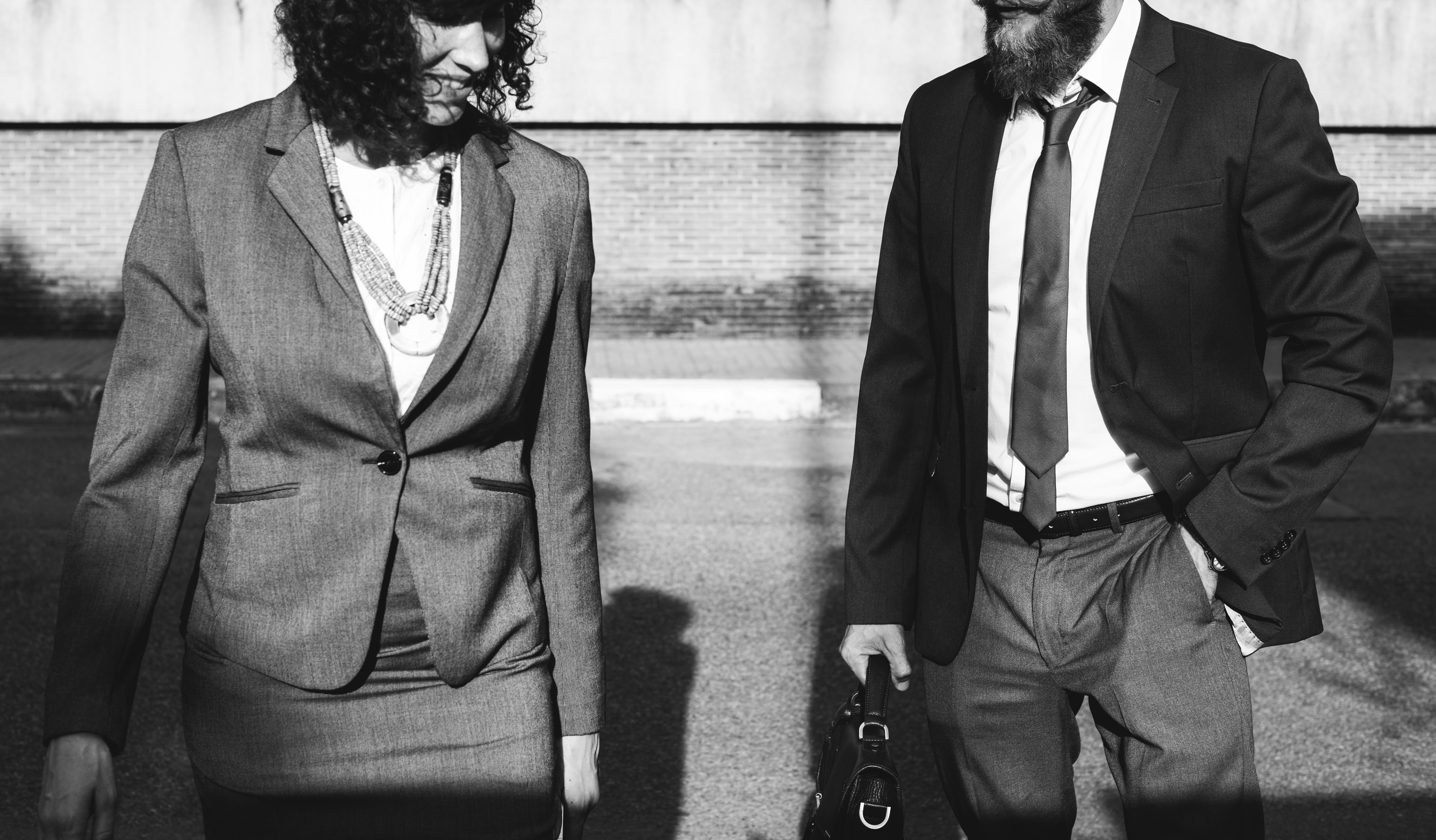 beard,smiling,smile,street,suit,briefcase,person,people,man and woman,tie,blazer,walking,commuter,commute,colleague,platonic,black and white,black & white,monochrome