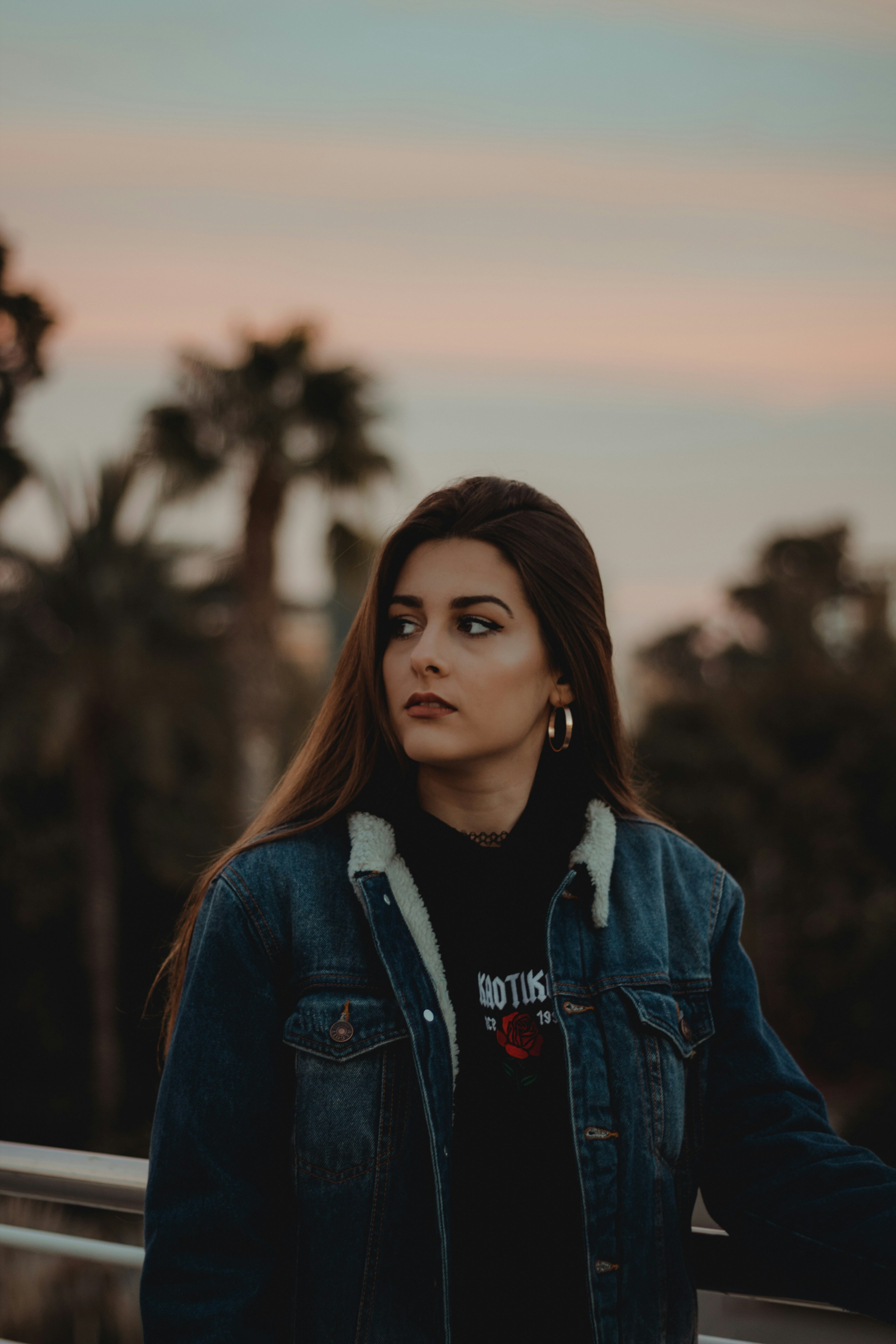 woman,female,portrait,model,face,makeup,earring,denim,jacket,night,dark,sunset,sunrise,coast,beach,palm tree,tree,#valenciagramers #tripographie #devonartph #marcosalberca #christiangarciaph #joserosp