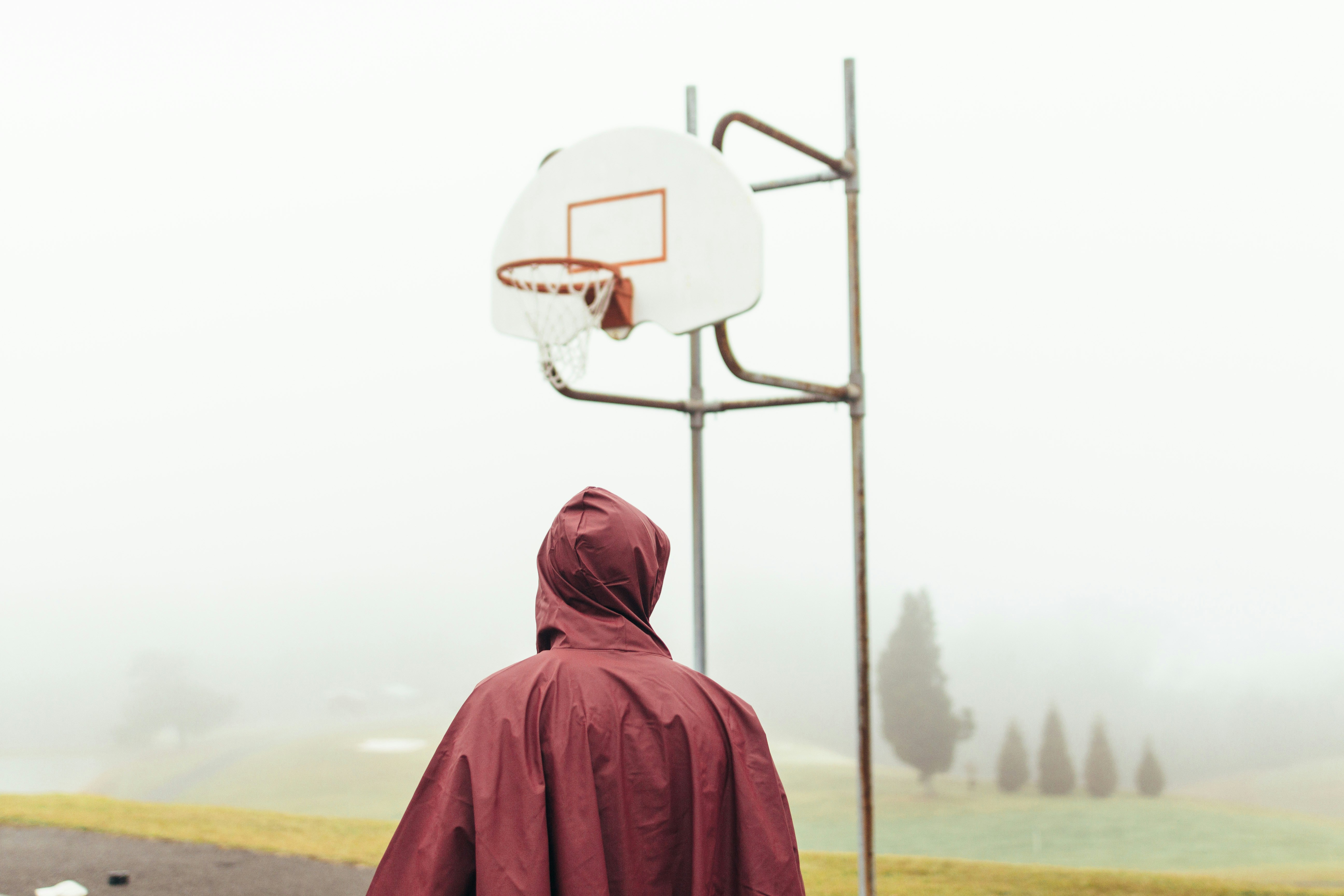 一名男子站在室外篮球场上,身穿夹克在pembroke雾蒙蒙的一天